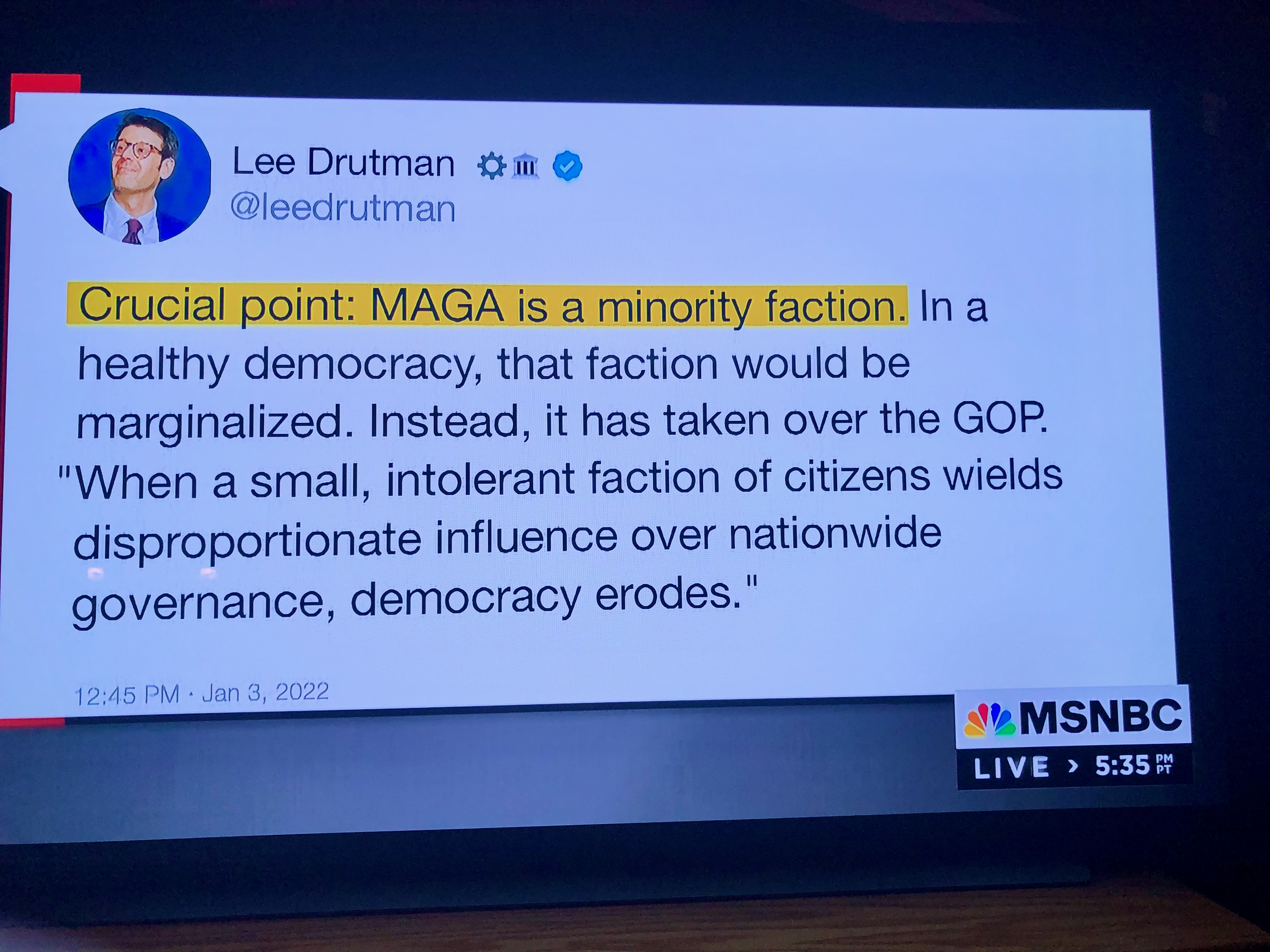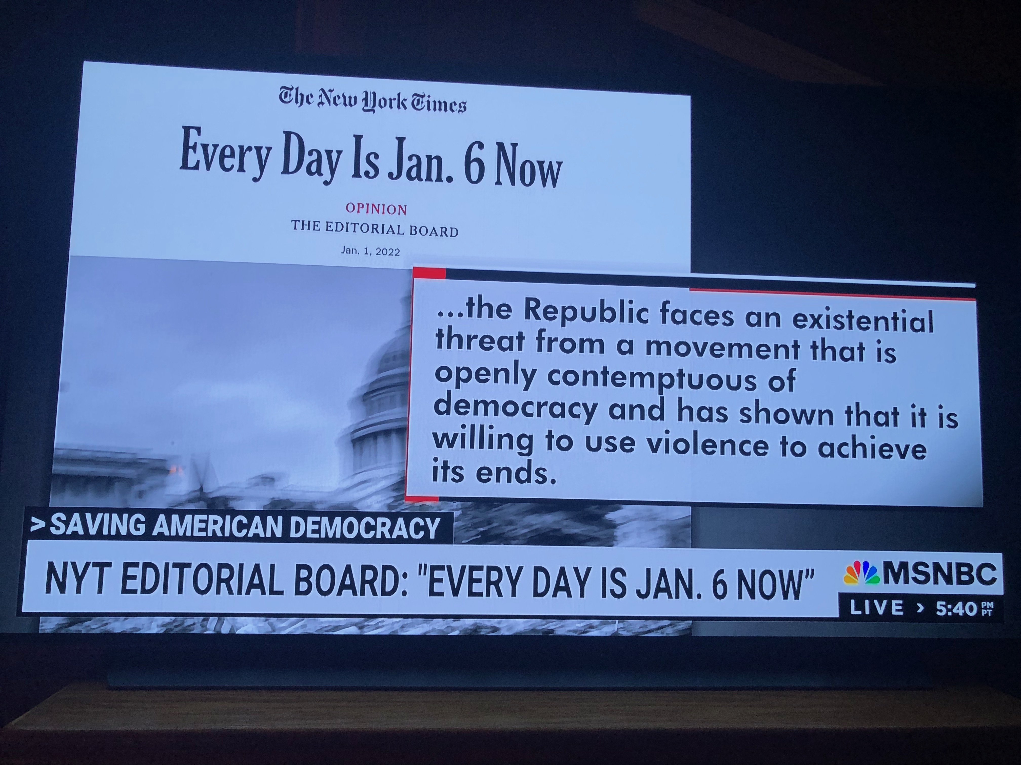 On January 1 the New York Times editorial board published "Every Day Is Jan. 6 now." I learned about it on today's Chris Hayes MSNBC show. The movement, of course, is the Trump-addled portion of the Republican Party, which as noted before, is a clear majority of the GOP.