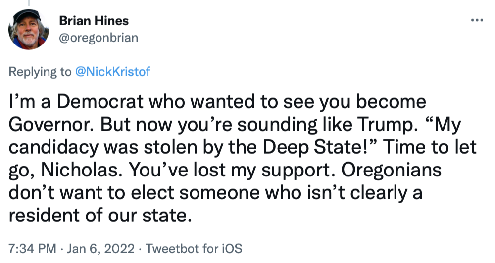 So that's another reason I no longer support Kristof. Plus, the Capital Chronicle tried to get the documents that Kristof claims show that he truly has been an Oregon resident for the past three years, but he refused to share them.