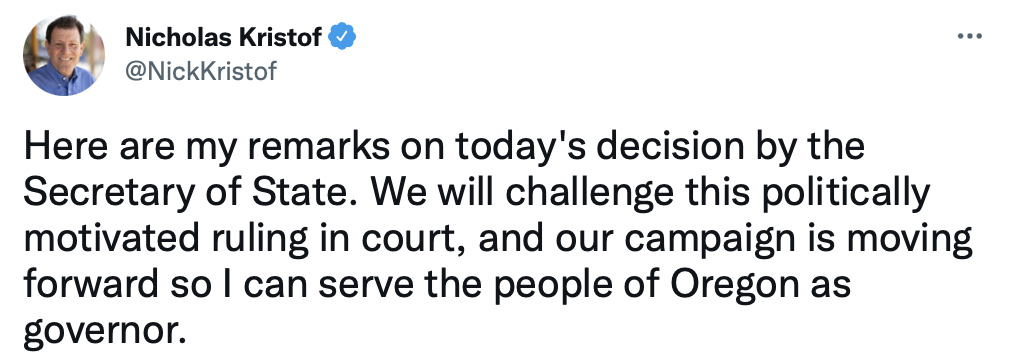 Yesterday the Oregon Secretary of State, Shemia Fagan, ruled that Kristof didn't meet the residency requirement to run for Governor. The Oregon Capital Chronicle, a great news source, said in its story: