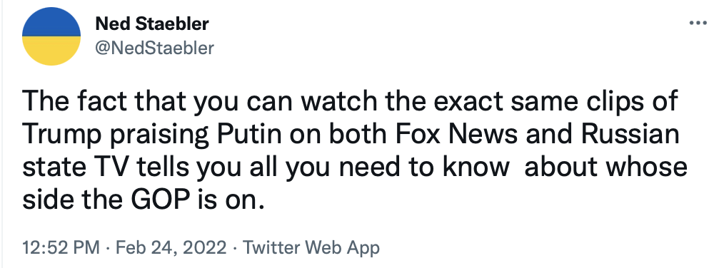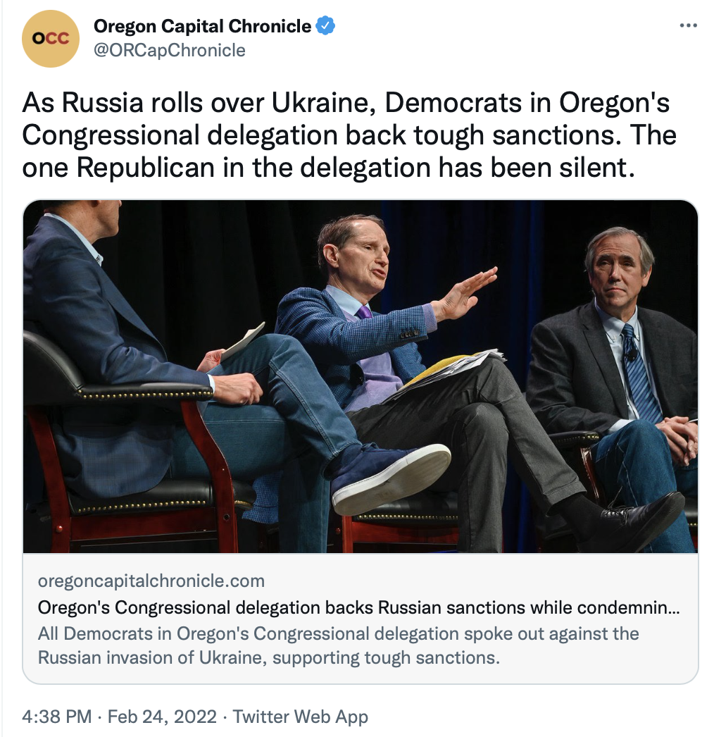 Sadly, it seems that most Republicans don't care about Trump's love of the havoc Putin is inflicting on the world. All of Oregon's Democratic members of Congress have condemned the invasion of Ukraine, while the sole Republican, Cliff Bentz, has been silent.