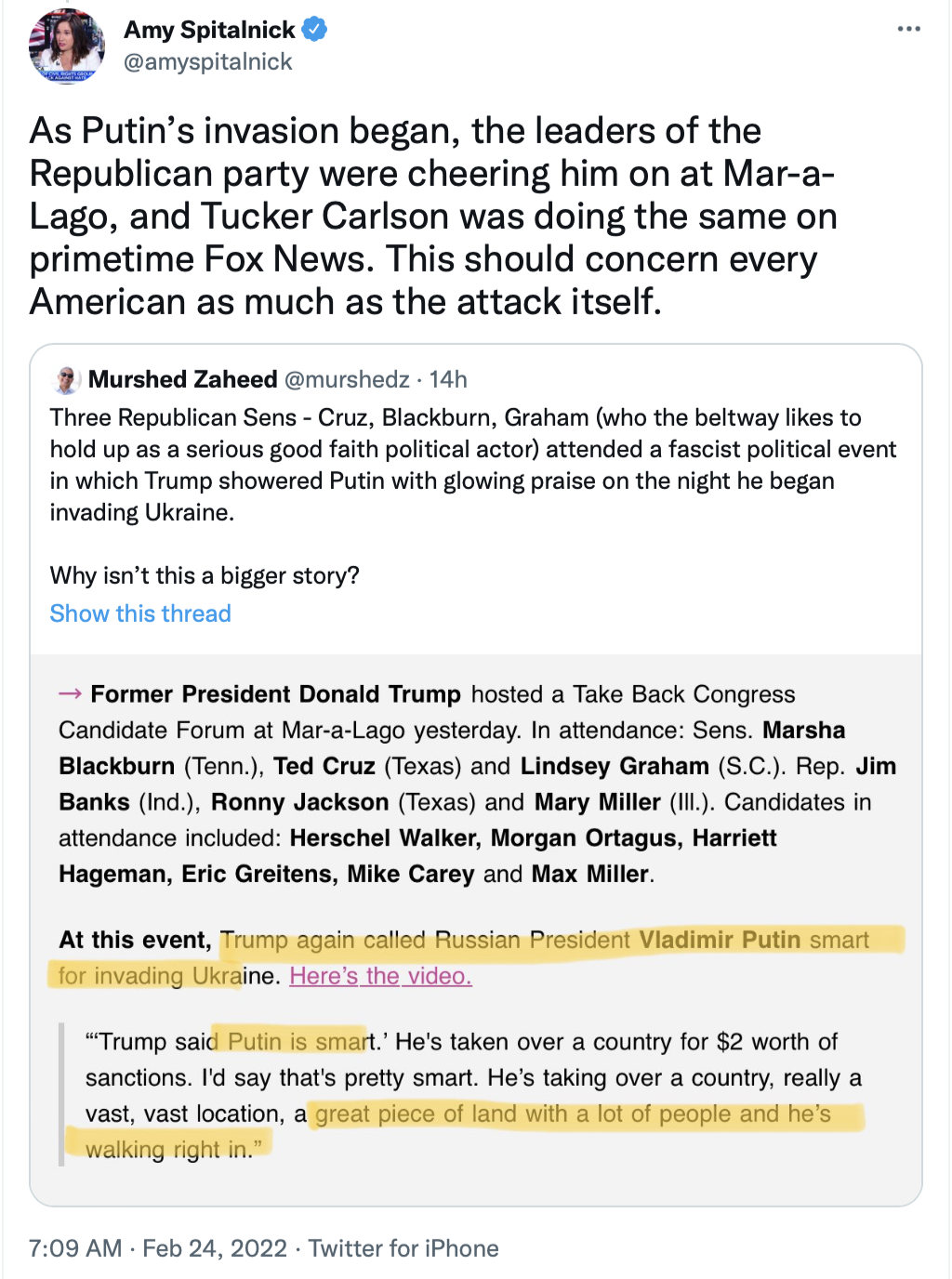 From the perspective of the warped demagogue Putin, his move into Ukraine now is indeed a smart move. Trump is absolutely correct. By saying Putin is smart does not at all mean the invasion is “fine and dandy” with him. Trump never said anything to that effect. That is wild and unfounded speculation and distortion by the blog host.