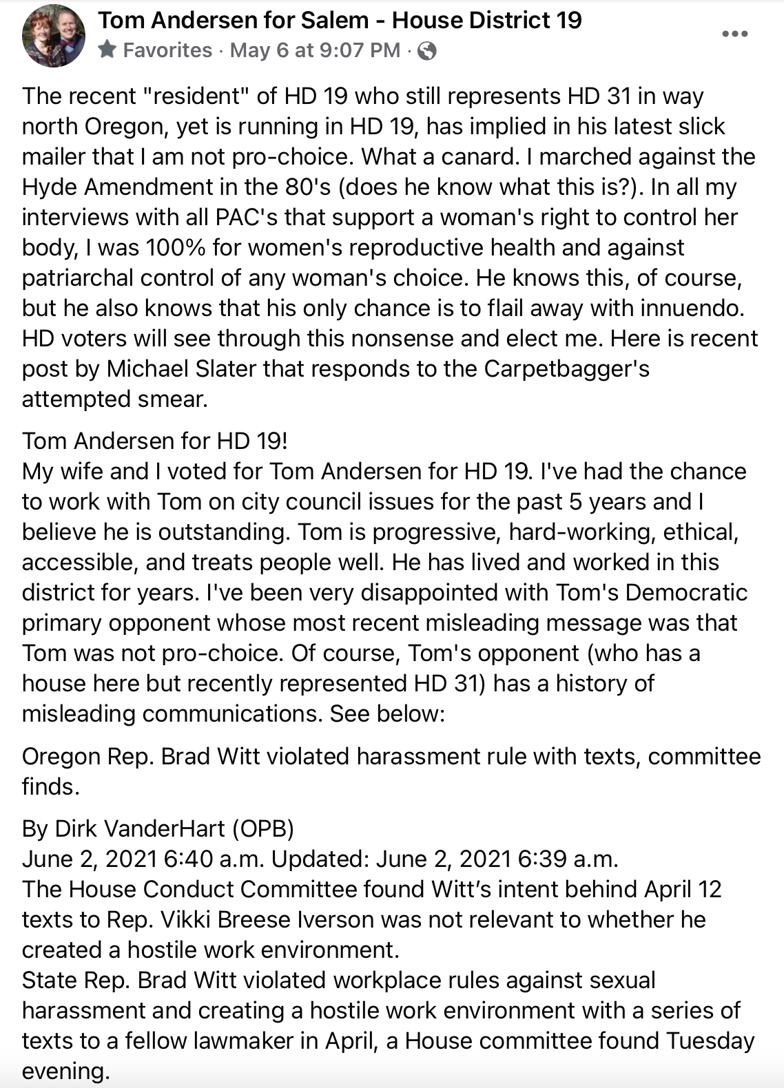 Today I learned the identity of the person who's been sending text messages wrongly accusing Tom Andersen, the Salem city councilor running in the Democratic primary for House District 19 against Brad Witt, of being weak on abortion rights.