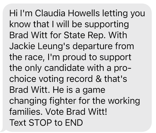 It didn't take much sleuthing, since Claudia Howells identified herself in the text message. Howells' husband, Bradd Swank, lost badly to Andersen in a 2014 City Council race, so this raises the question of whether retribution is a motive for Howells. Or maybe she just doesn't like people not named Brad/Bradd. Here's the 2014 election result and the text message.