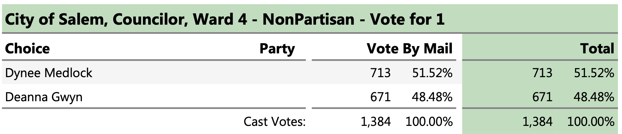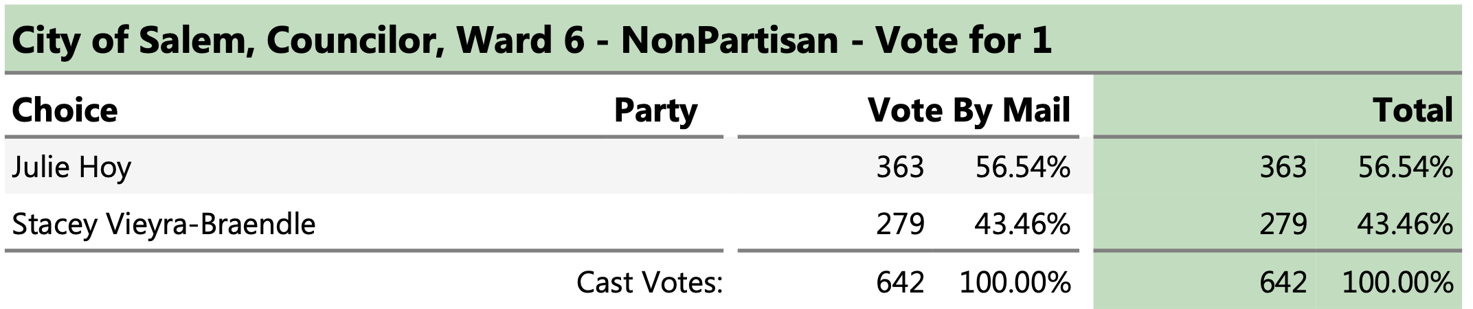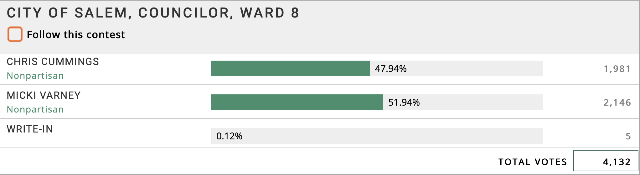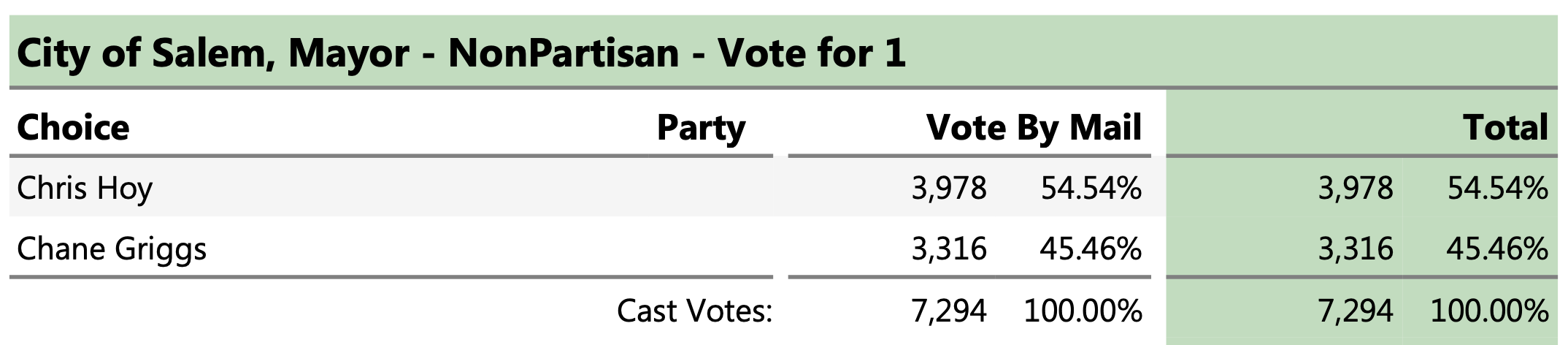 Chris Hoy leads in the race for Salem Mayor over Chane Griggs. This would be a pleasing win for progressives, since conservatives have occupied that seat for quite a while, and Griggs pulled in big bucks from the usual Chamber of Commerce-type business groups.