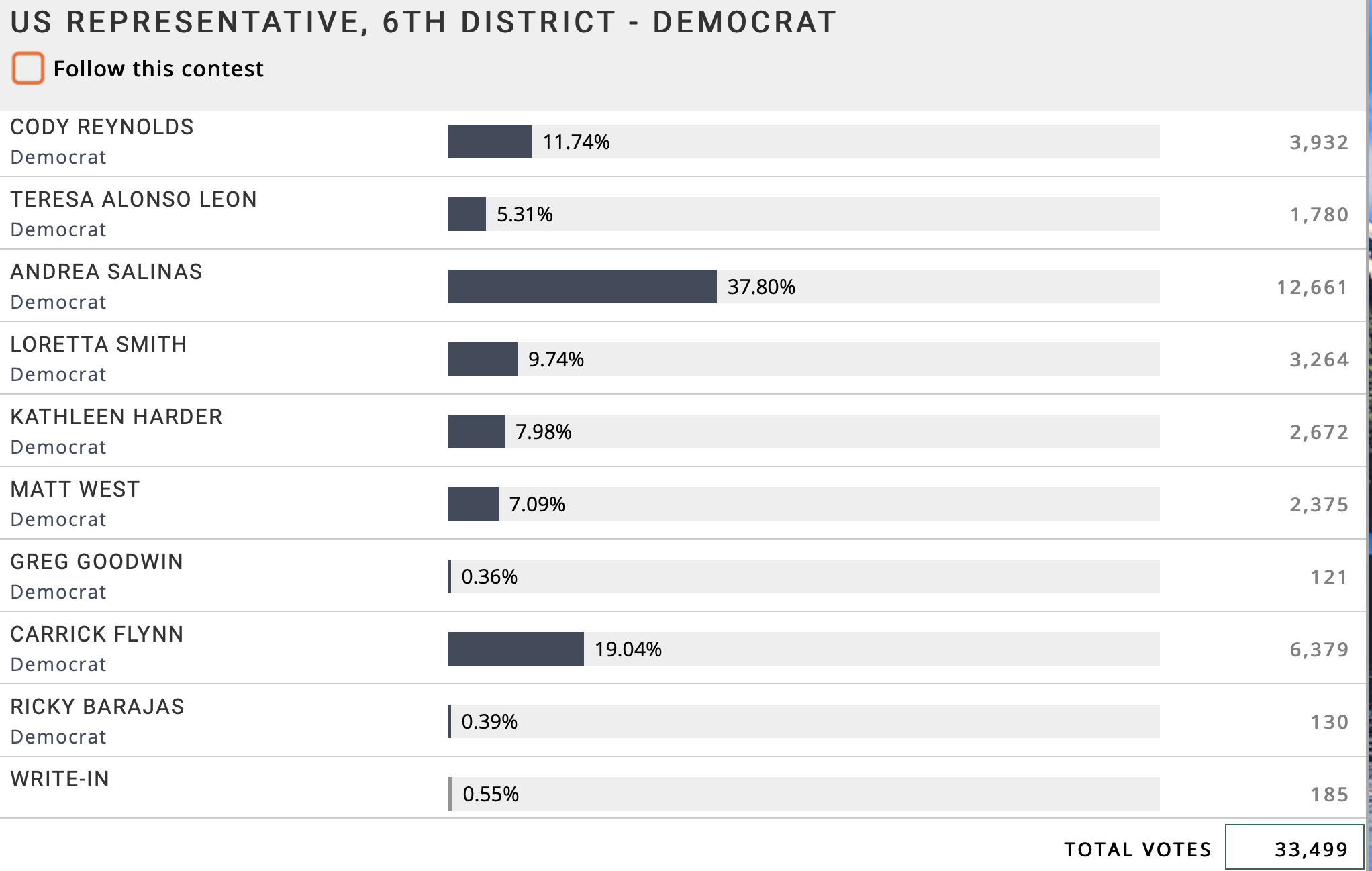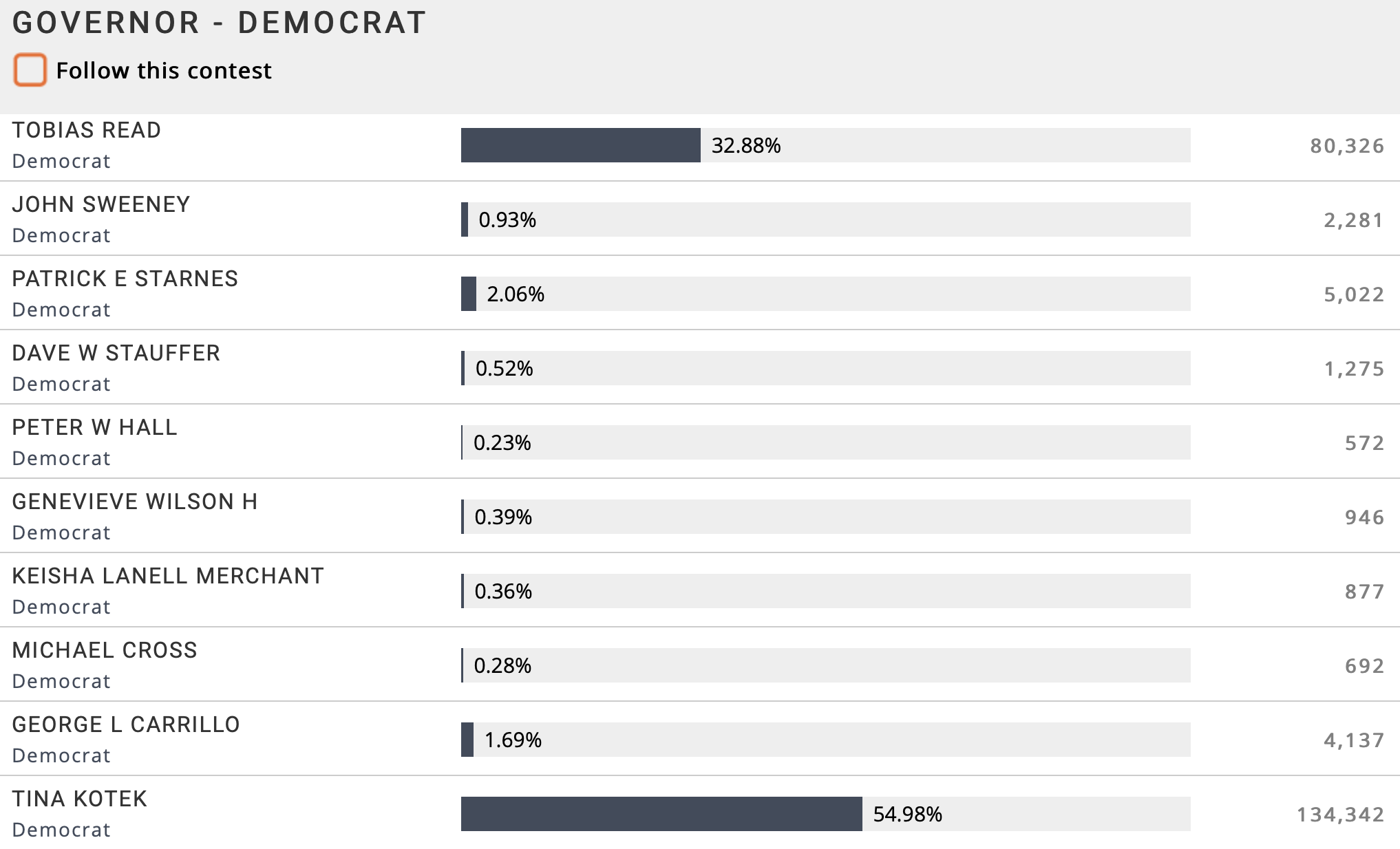 It looks like Tina Kotek will be the Democratic nominee for Governor. There were even more candidates, but I cut the screenshot off since nobody has heard of most of them.