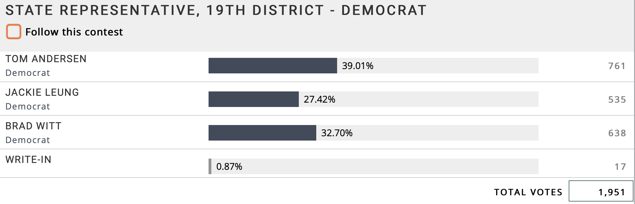 In the Democratic primary for the 19th House District in the state legislature, progressive Salem city councilor Tom Andersen leads Brad Witt by a fairly comfortable margin. Jackie Leung, another progressive city councilor, dropped out of the race but remained on the ballot and is getting over a quarter of the vote.