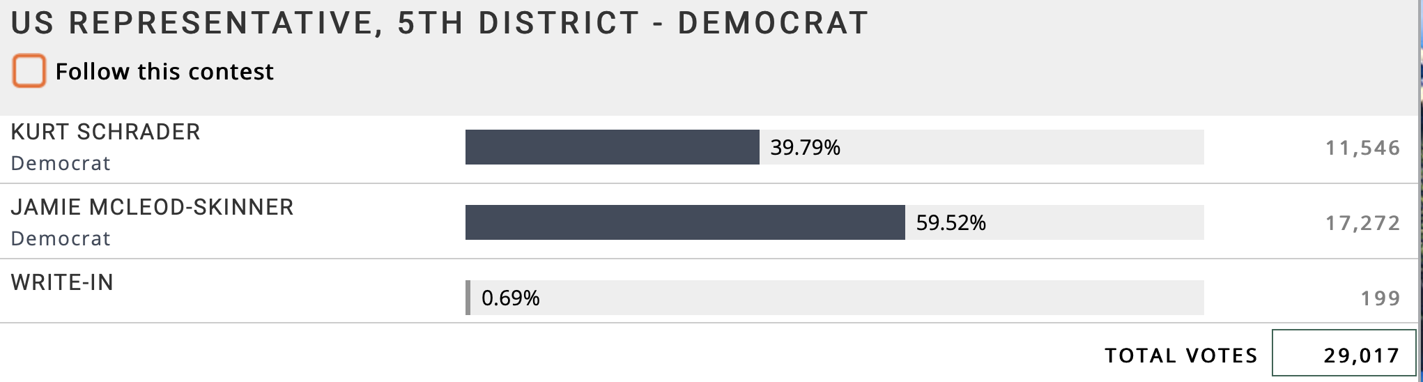 Lastly, Kurt Schrader is getting beaten badly by Jamie McLeod-Skinner in the 5th Congressional District race which includes part of Marion County. Schrader has voted in Congress against progressive priorities numerous times, so this would be a sweet victory for those who want a real Democrat to represent them.