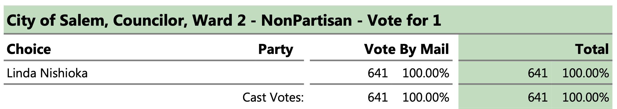 Since Linda Nishioka was unopposed in the Ward 2 city council race, that's an easy win for a progressive.