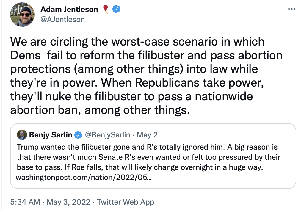 Since there aren't 51 Democratic votes for doing away with the filibuster in the Senate, and no abortion rights bill can get 60 votes, the chance of such a bill passing is essentially zero. Which raises the question: why didn't Democrats enshrine the right to an abortion in legislation when they had the chance at a time when this was possible since 1973, assuming it ever was?