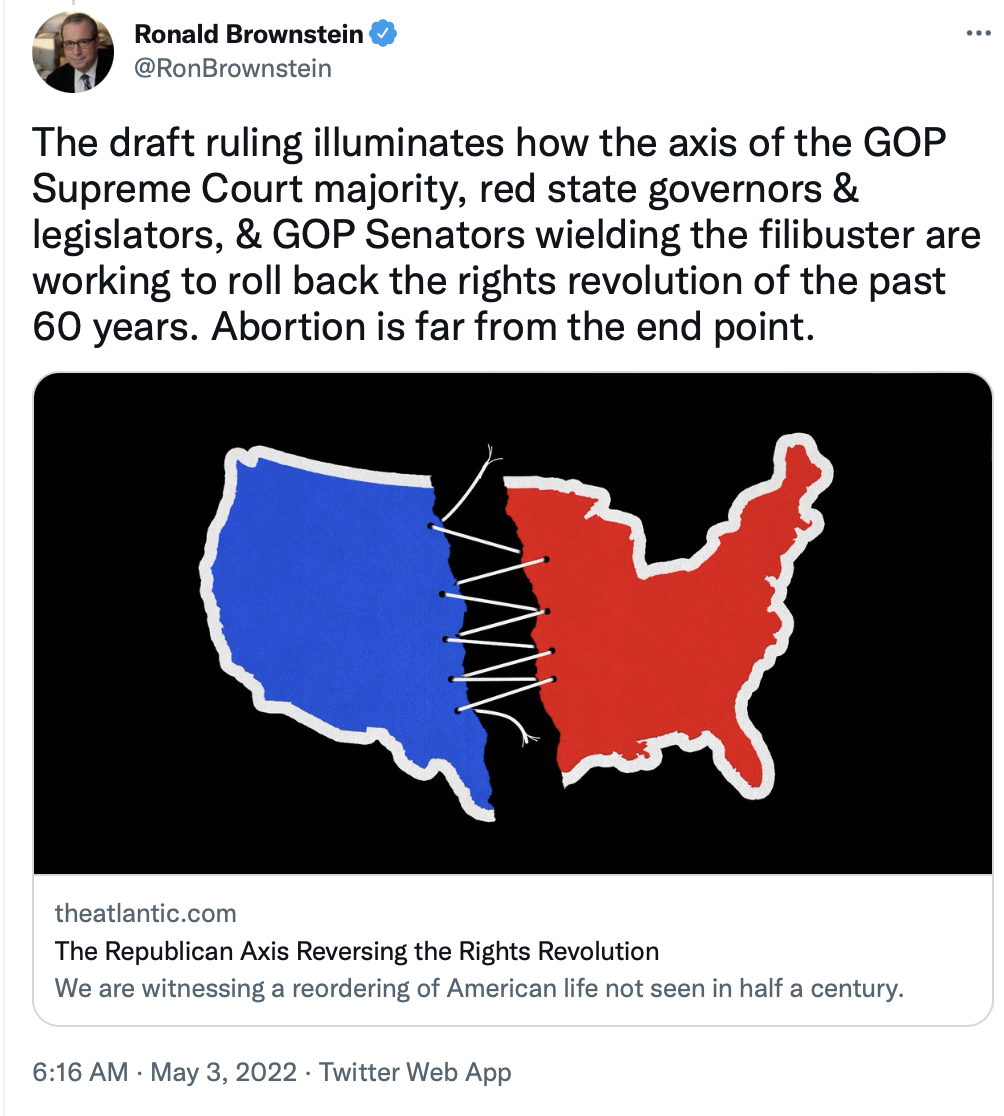 Even worse, there's good reason to believe that the Supreme Court won't stop with doing away with the constitutional right to an abortion, but could reverse other rights also, such as same-sex marriage and contraception. So says a piece in The Atlantic, "Alito's Plan to Repeal the 20th Century."