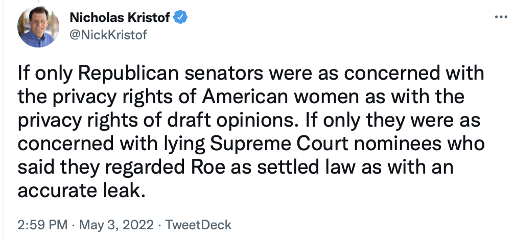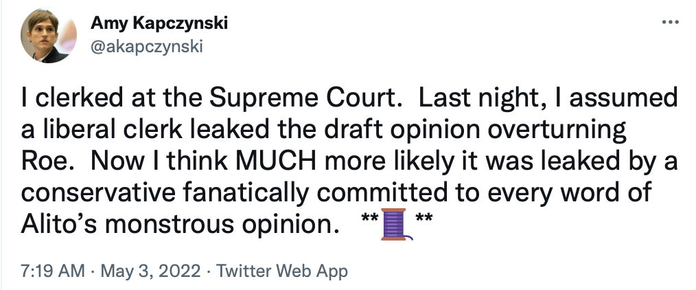 Below I've shared some tweets from my Twitter feed that I especially liked out of the many views about the Supreme Court leaked draft order that I read today. You'll see that a woman who clerked at the Court has changed her mind about who likely sent the draft order to Politico reporters.
