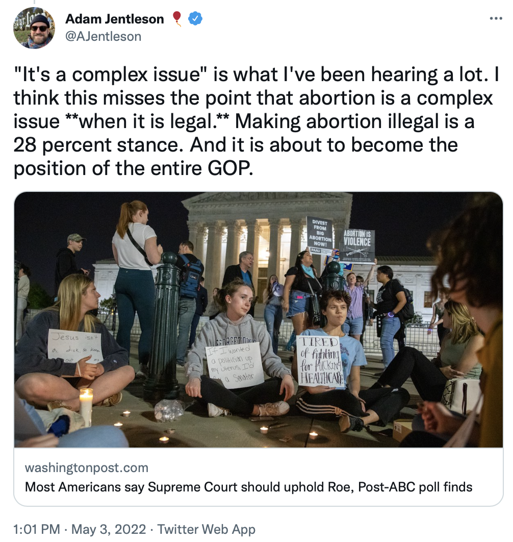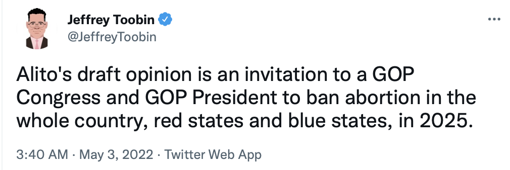 Now that will be more difficult, since any weakening of the draft order will infuriate anti-abortion activists who want abortion illegal in any state that wishes it so, and ideally in the entire country — which could happen if Republicans get control of both the House and Senate in 2024, along with the presidency.