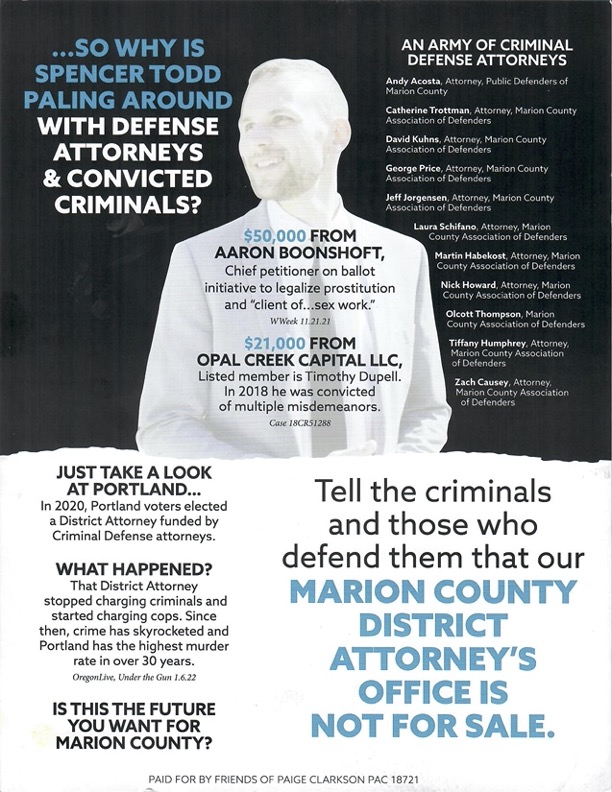 A recent mailer I got from Friends of Paige Clarkson, who is running to be the Marion County District Attorney, shows why voters should cast their ballot for Spencer Todd, her opponent.