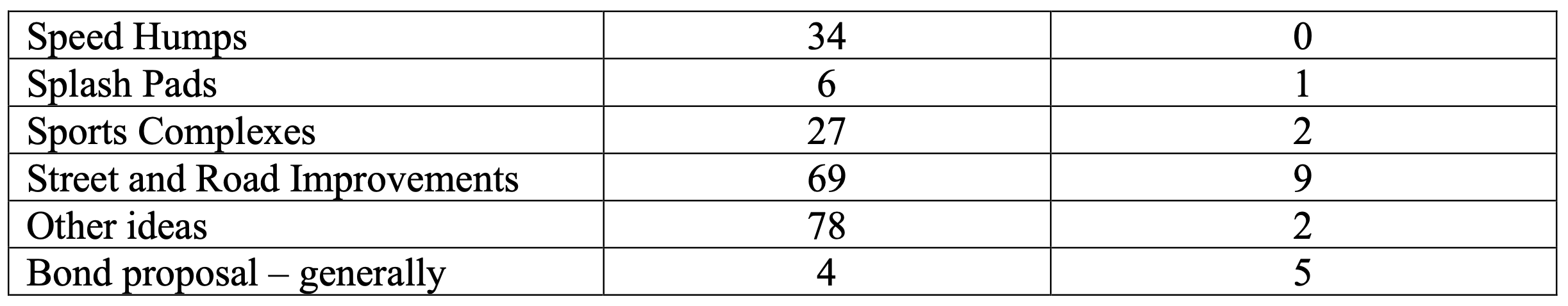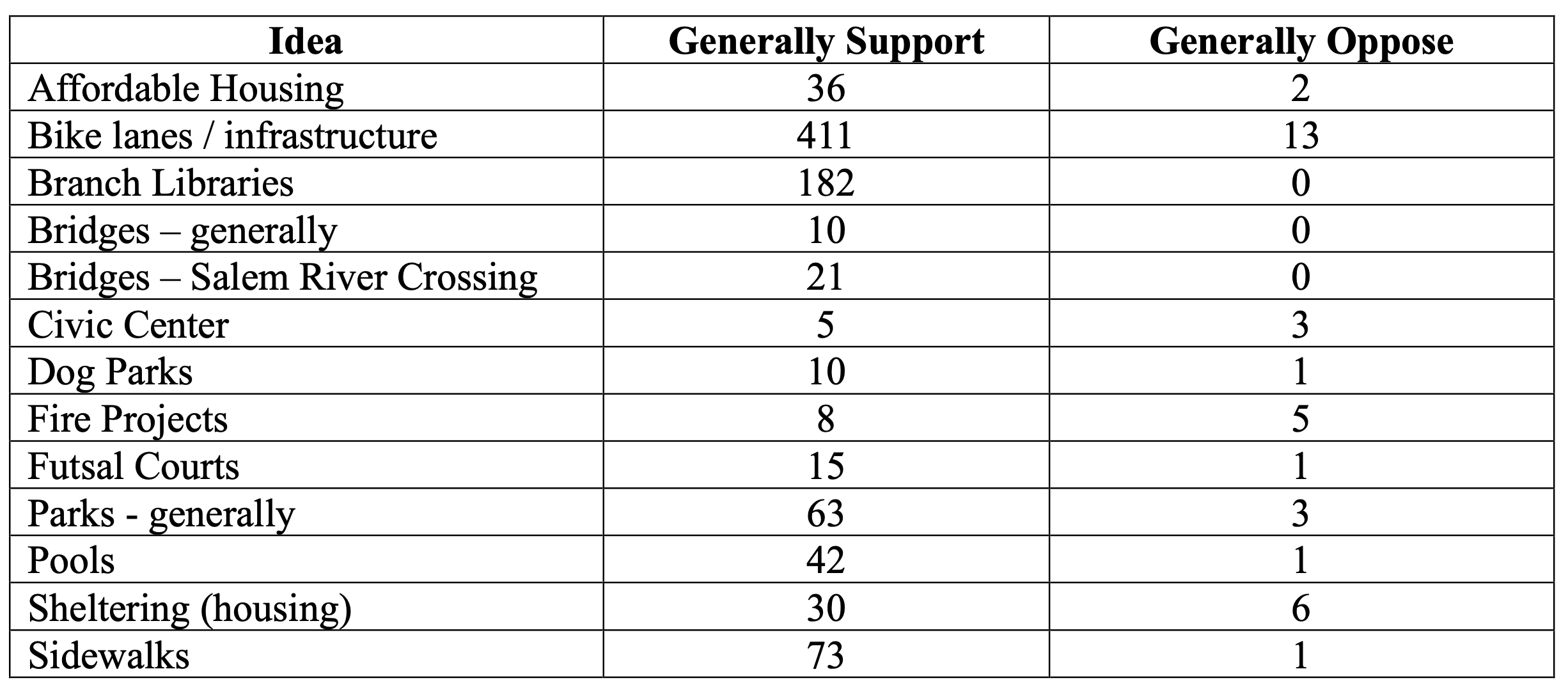 Such as, bike lanes were by far the most popular item in a list of projects that could be included in the bond measure, based on public comments/feedback. Councilor Stapleton asked for this information.