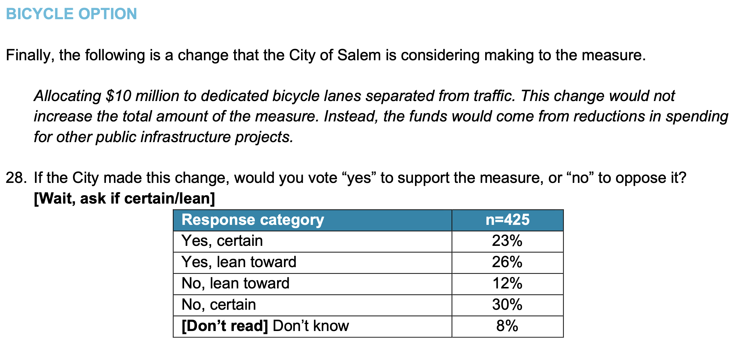 Instead, those responding to the survey were asked if they'd vote yes or no on the entire measure, just because protected bike lanes were included.
