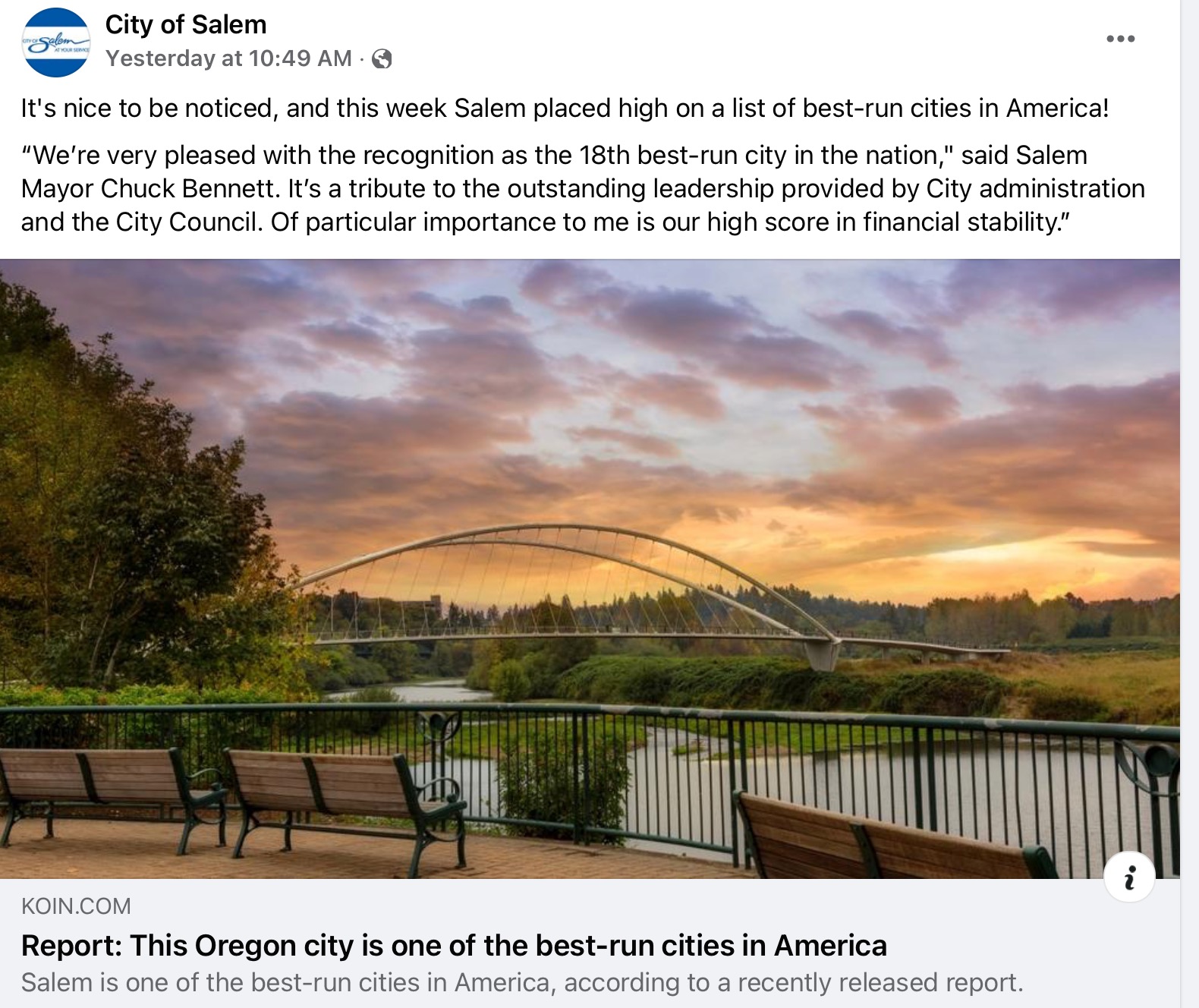 The City of Salem Facebook page was all proud about Salem supposedly being one of the best-run cities in America. Not surprisingly, Mayor Bennett said it showed how wonderfully the folks at City Hall are doing.