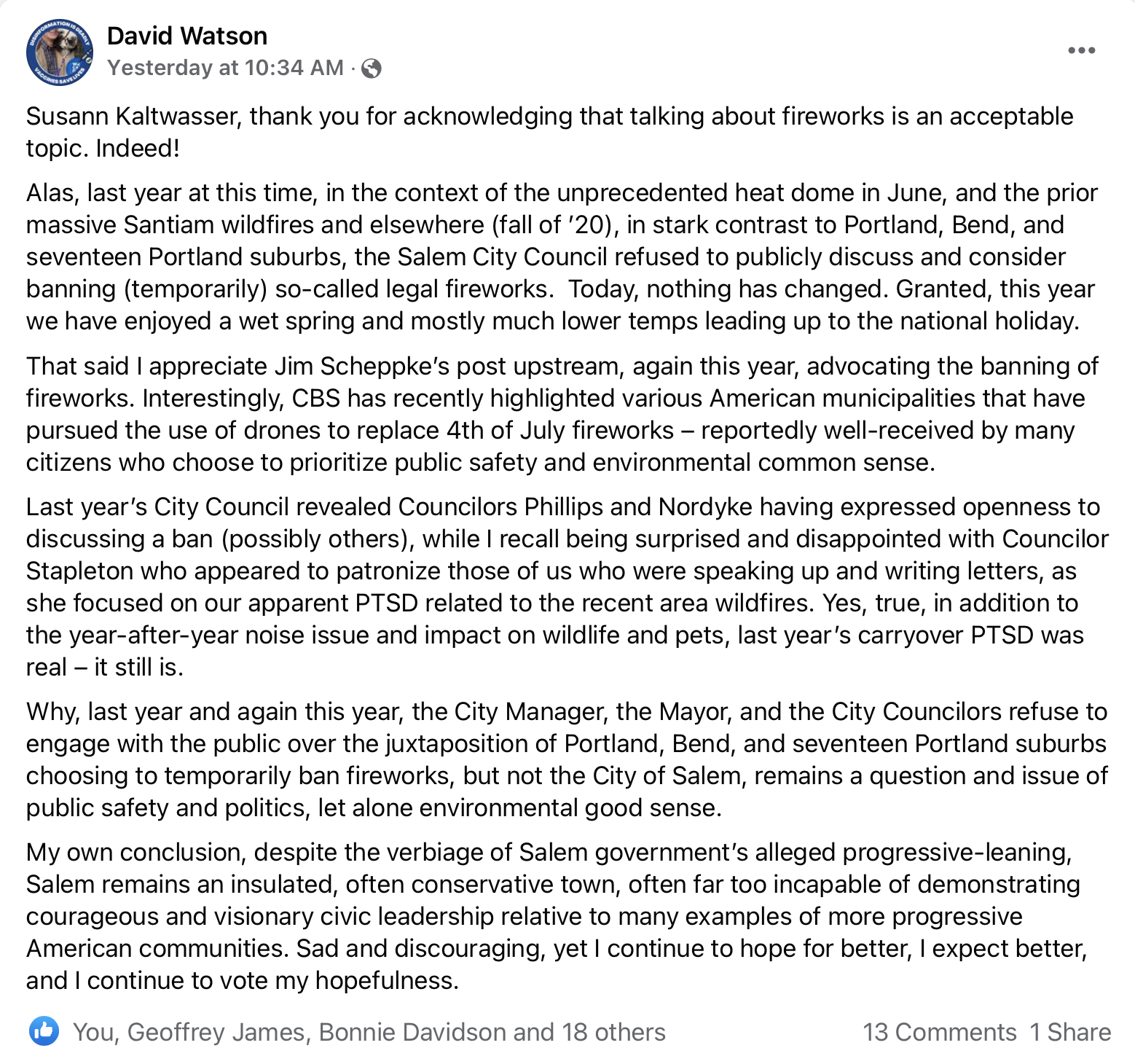 Given how harmful fireworks are to people, animals, and the environment, why the heck does Salem still allow them? A Facebook post on the page where City Council issues are discussed makes a great case for the City Council banning fireworks. (Kaltwasser is a page administrator.)Screen Shot 2022-07-05 at 8.54.49 PMNicely said, David Watson. I too am hopeful that the City Council will start a discussion about a citywide fireworks ban. It's definitely needed.