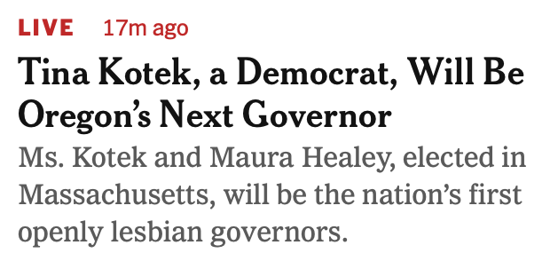 (1) Most importantly, Tina Kotek has been declared the winner of Oregon's Governor race over Christine Drazan. This was my #1 nightmare pre-election, having to spend four years watching a Republican governor undo Kate Brown's accomplishments — notably her executive actions on fighting climate change. Nice to see this headline in tonight's online New York Times.