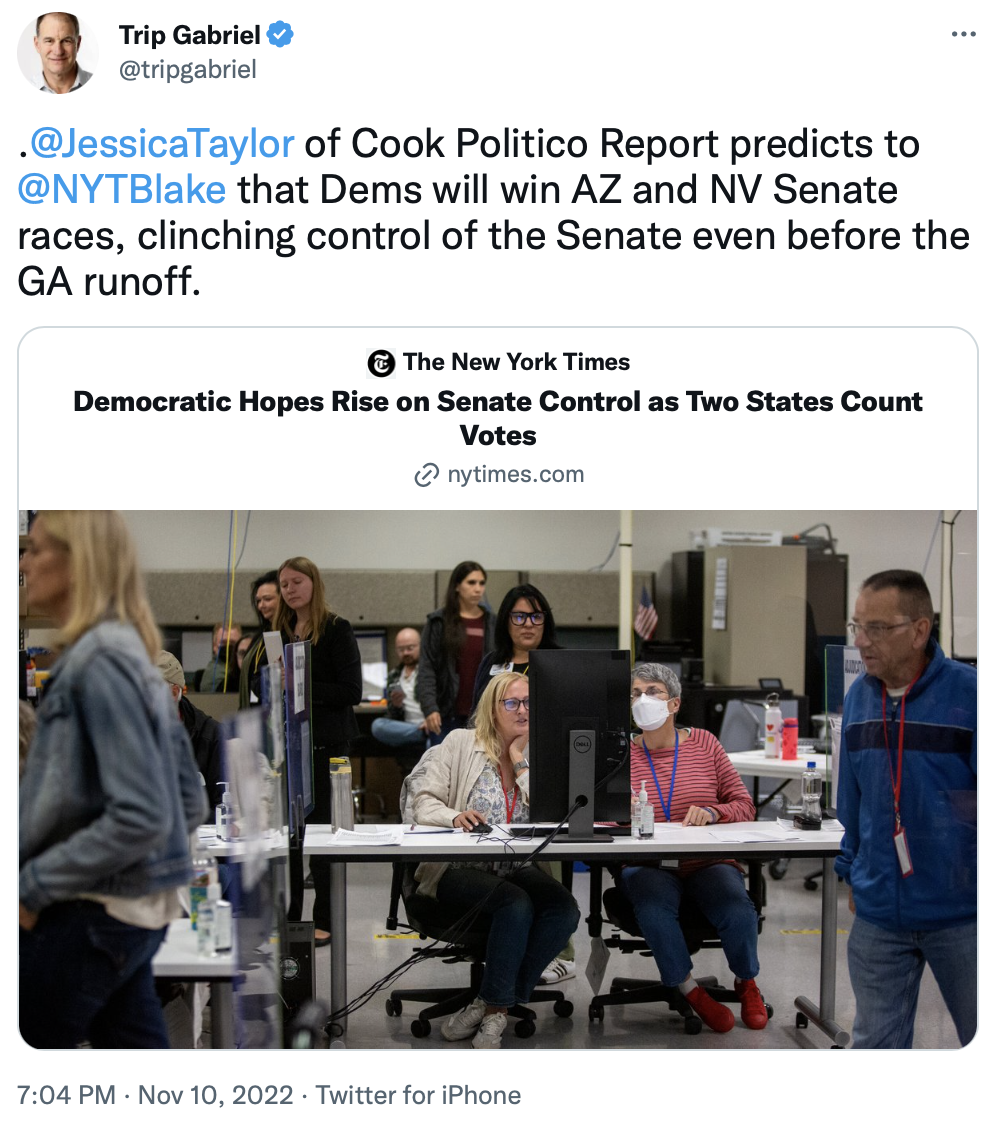 But election updates in Arizona and Nevada today have things looking good for two Democrat senators seeking another term, Mark Kelly and Catherine Cortez Masto. A couple of recent tweets tell the tale. Nate Cohn is the New York Times polling/political analyst.