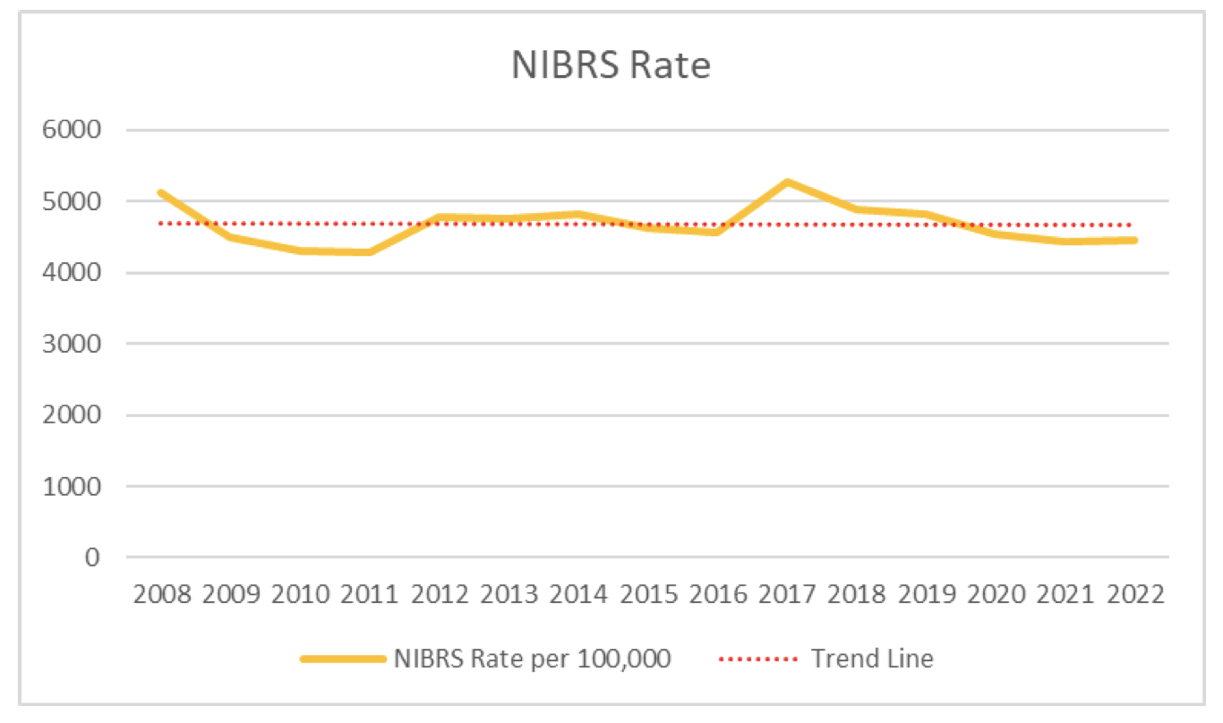 Screenshot 2023-01-23 at 8.50.05 PMThis is the most inclusive crime statistic. NIBRS includes homicide, rape, aggravated assault, robbery, burglary, motor vehicle theft, larceny, and arson. The trend line of the rate per 100,000 Salem residents over the past 15 years is flat. So overall the crime rate is very stable.
