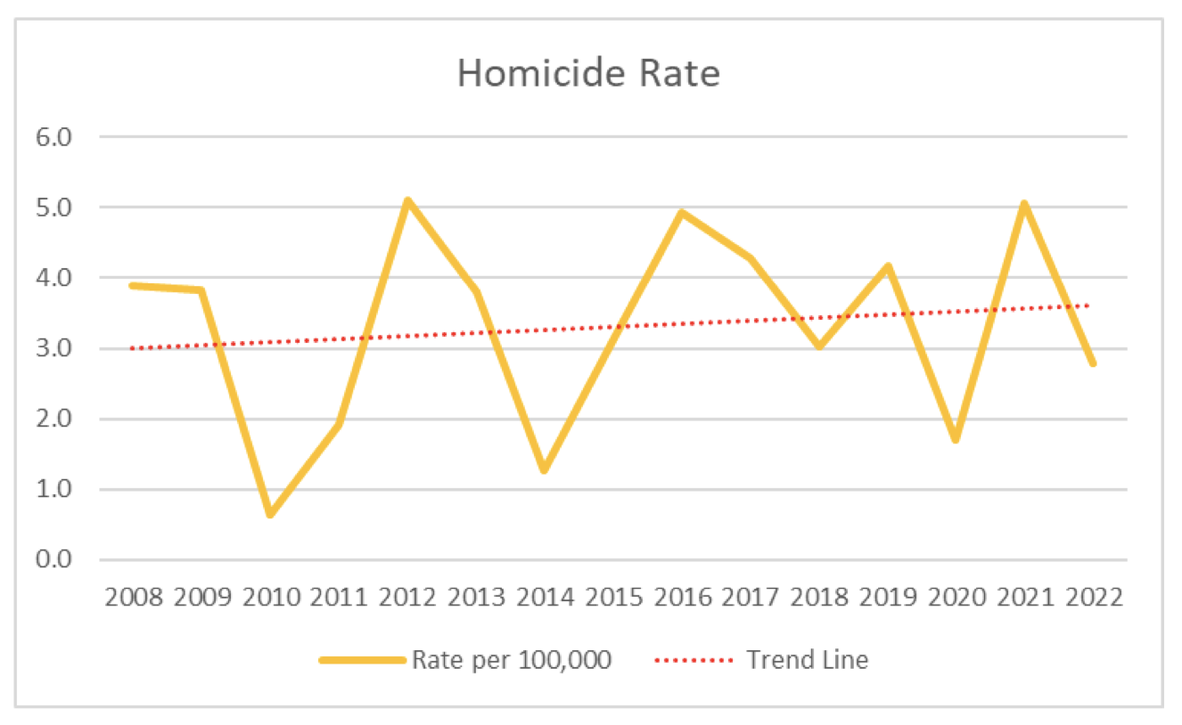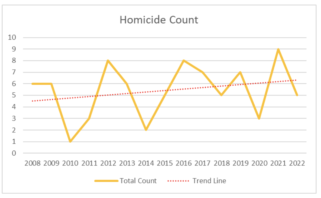 Screenshot 2023-01-23 at 9.12.13 PMScreenshot 2023-01-23 at 8.50.40 PMHomicides, or murders, get a lot of attention. But they're rare in Salem, ranging from 1 to 9 homicides a year over the past 15 years. This leads to a lot of fluctuations in the homicide rate. Yes, it is trending upward slightly, from 3.0 per 100,000 population to about 3.7. However, that trend line is so dependent on rare homicide events, it isn't very meaningful.