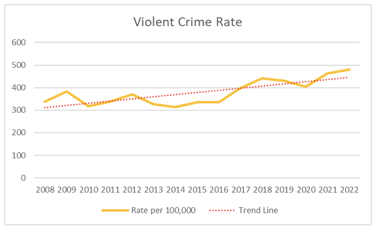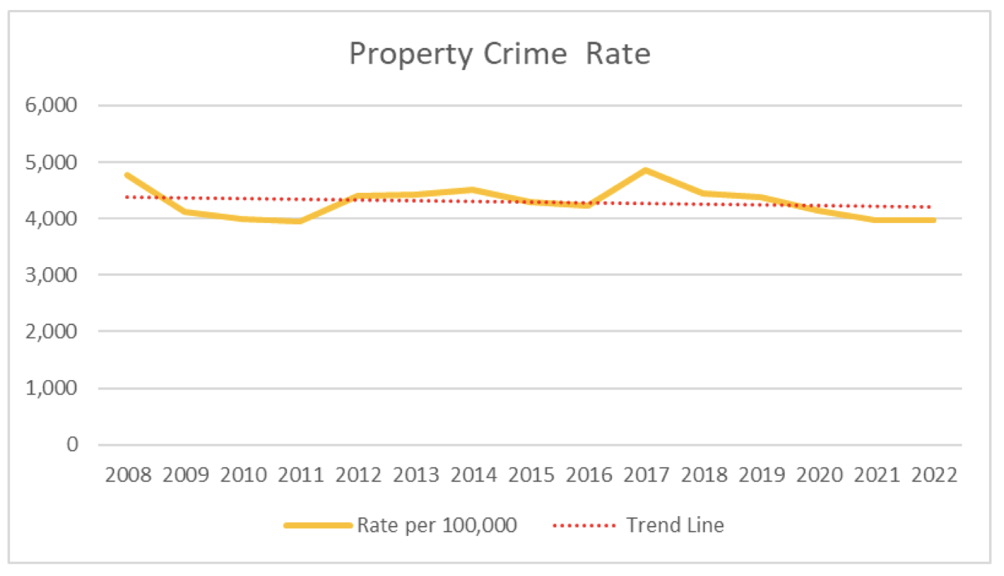 So the Police Department data show that overall, the rate of crime in Salem has been stable from 2008-2022. A rise in the violent crime rate has been offset by a decline in the property crime rate.