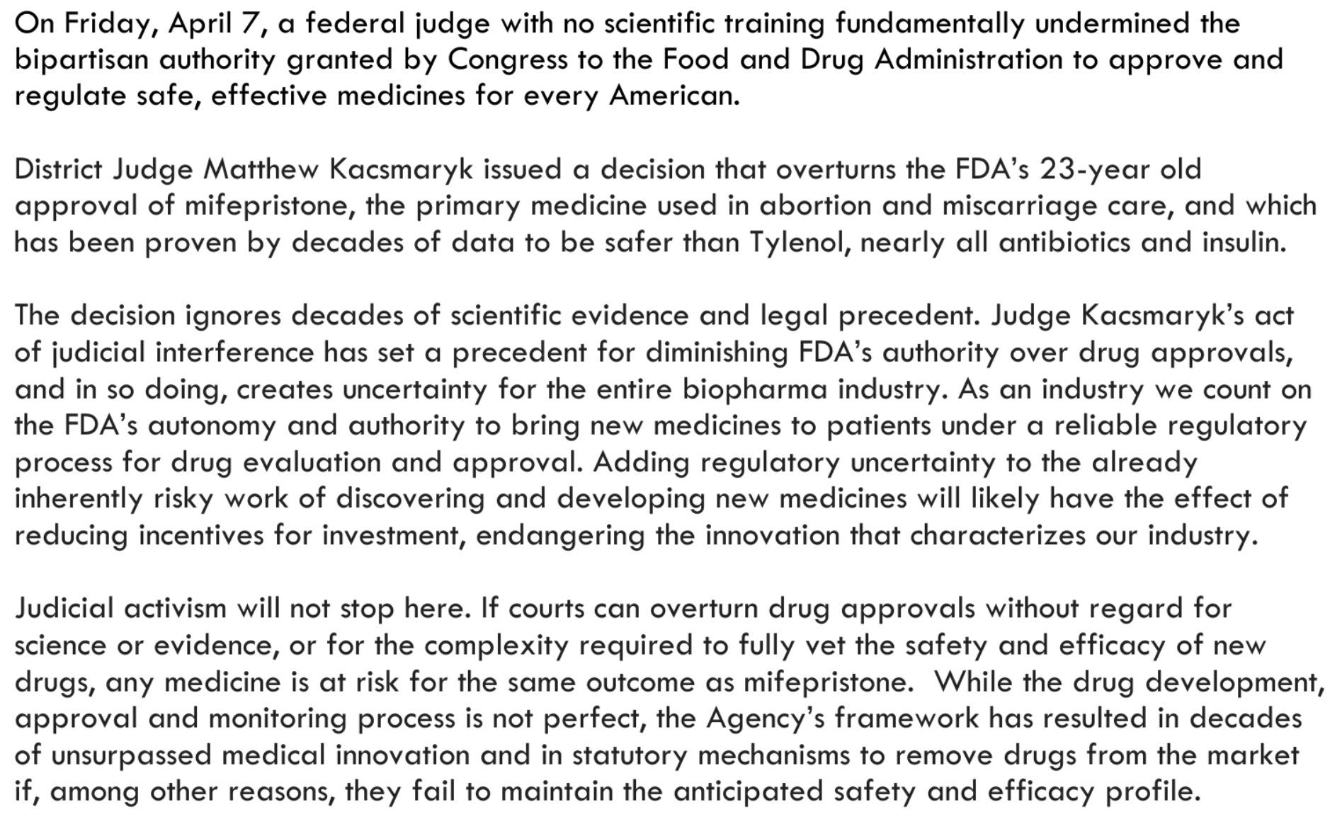 It was great to see that executives of leading pharmaceutical companies, along with many others, have signed a letter condemning Judge Kacsmaryk's decision and warning of the consequences for other safe and effective drugs.
