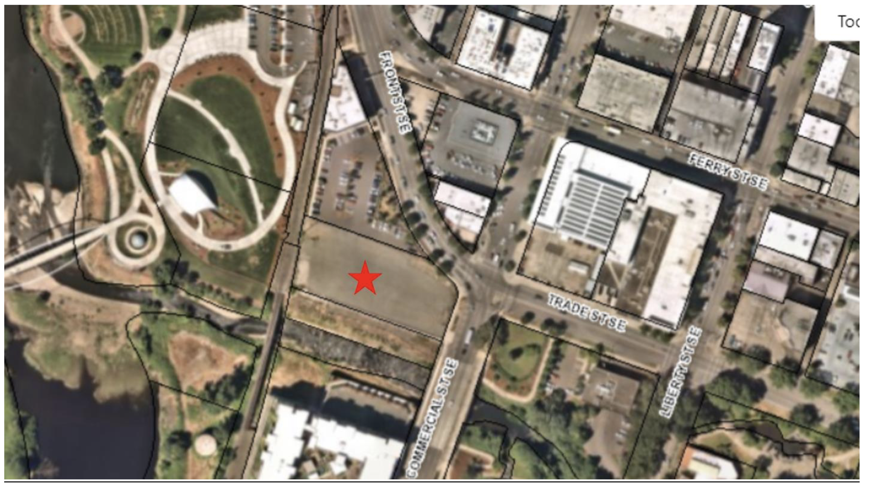 The property is marked with a red star. The triangular Park Front building is above it. The South Park apartments are below it. Riverfront Park is to the left of it.