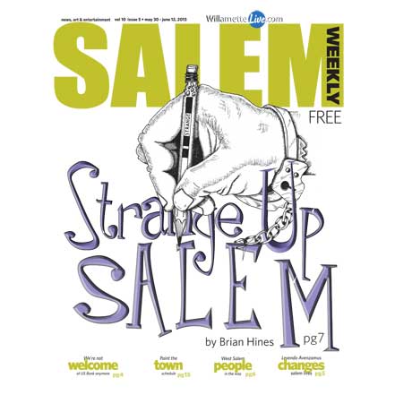 Salem Weekly was our city's alternative newspaper from 2004 until 2018. I loved reading it. I also wrote a Strange Up Salem column that appeared in it from May 2013 to May 2015. This was the cover of the issue where my first column ran. The drawing was by the multi-talented Salem Weekly publisher, A.P. Walther.