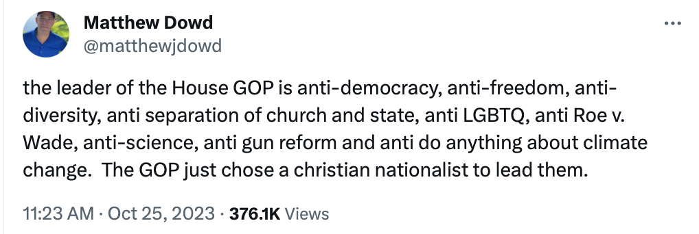 Yet today he was unanimously chosen to be Speaker by the House Republican caucus. That means every single Republican in the House of Representatives was totally fine with being led by a guy who this post on X cogently describes.