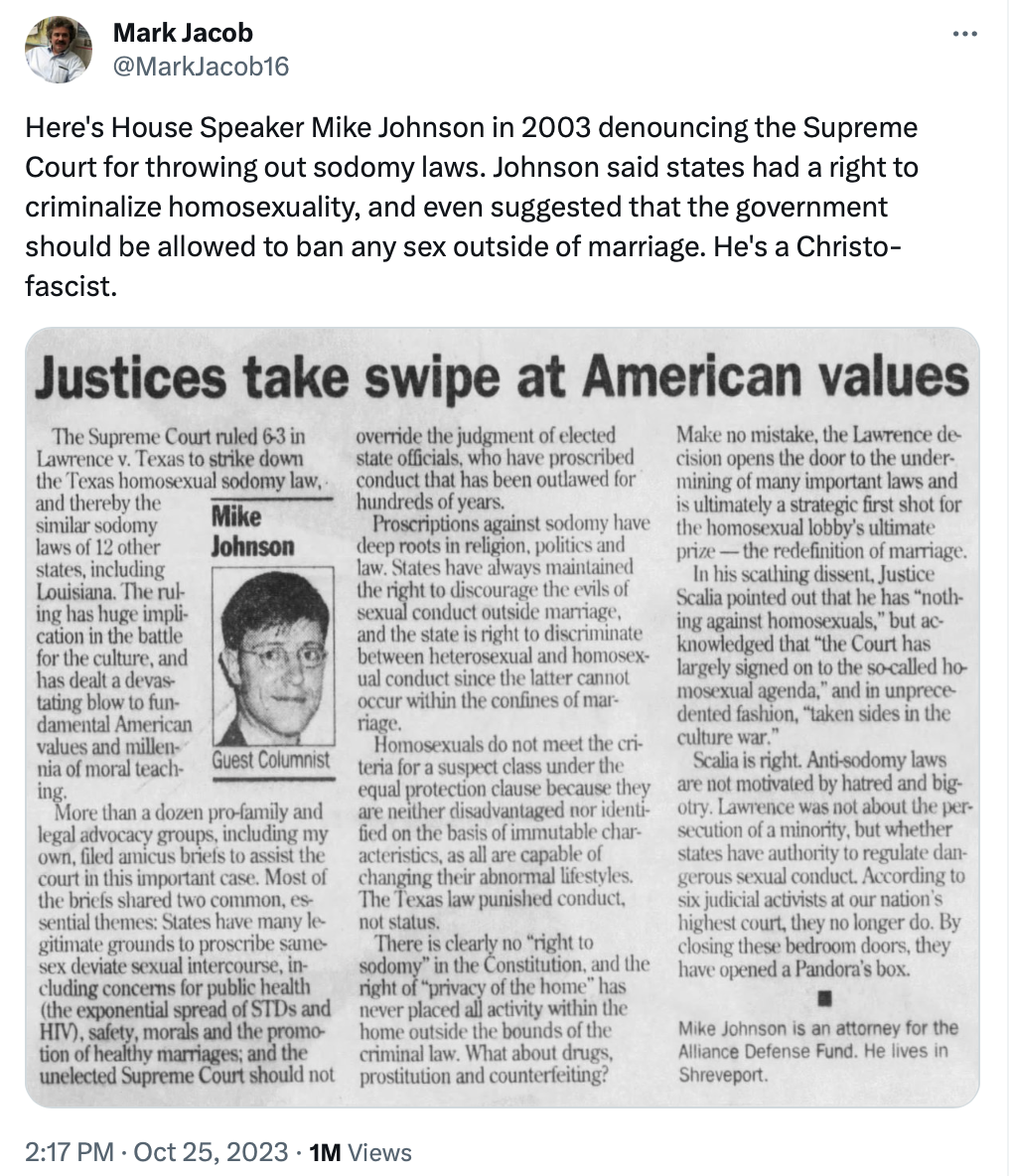 Here's what Speaker Mike Johnson wrote about homosexuality in 2003.
