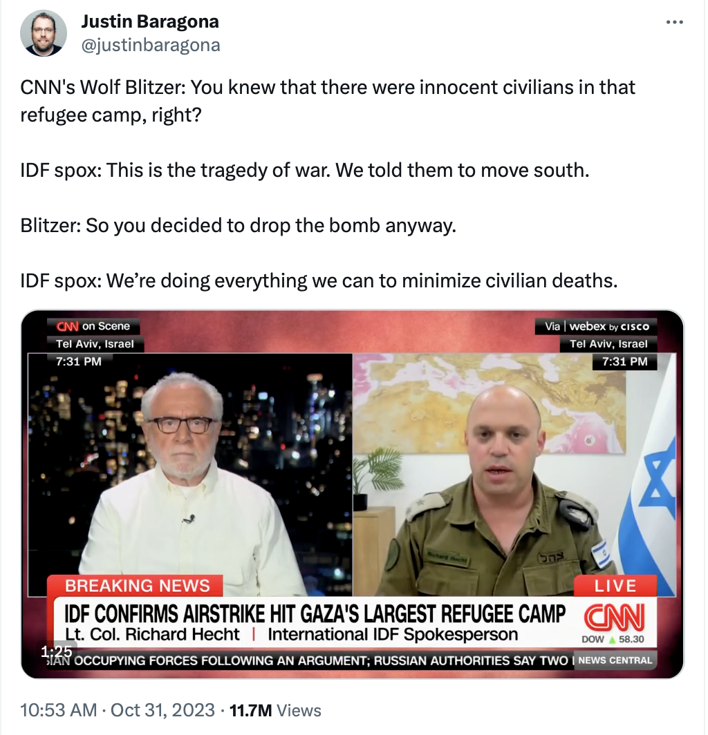 But I felt that Israel occupied the moral high ground after the Hamas attacks. Now, though, Israel is squandering that moral authority by the brutal way it is conducting war in Gaza, which is run by Hamas.