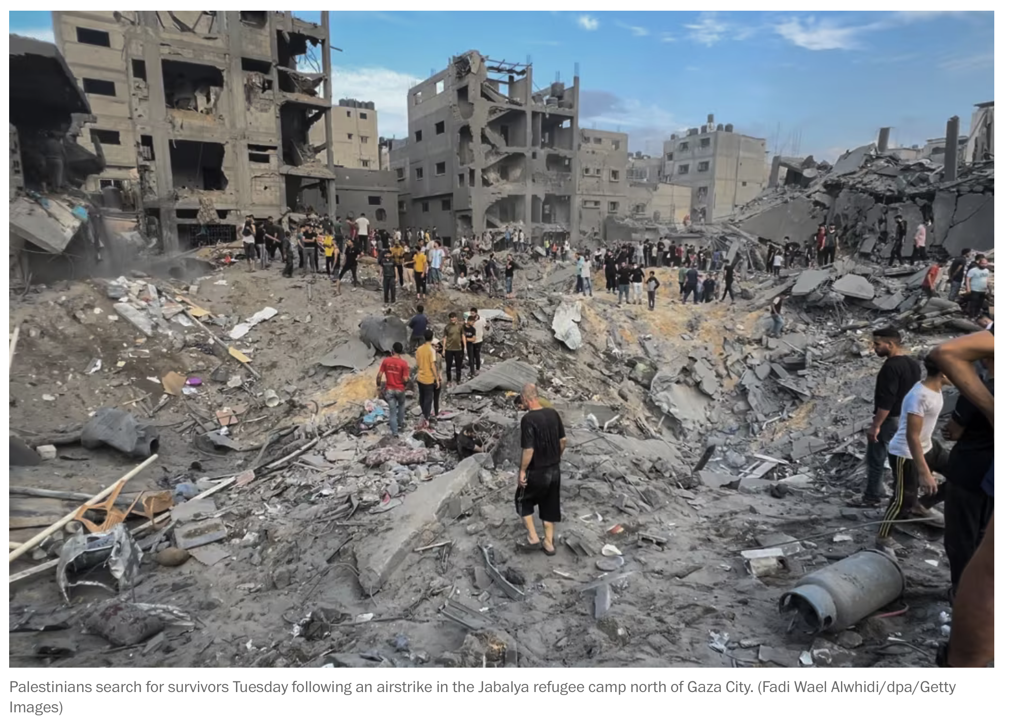 Here's how a Washington Post story, "Israel strikes on Jabalya refugee camp kill and injure hundreds in Gaza," starts out.