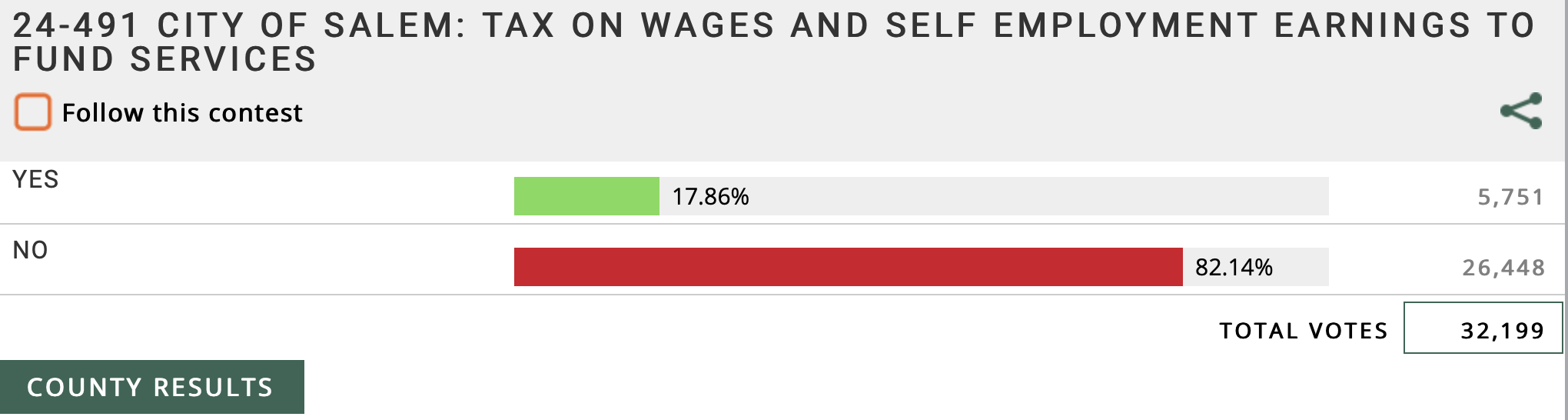 So when the payroll tax got a "Yes" from only 18% of Salem voters in yesterday's election, they weren't just sending a message. They were screaming it from the rooftops. Both in the Marion County part of Salem and the Polk County part in west Salem (where just 16% said "Yes").