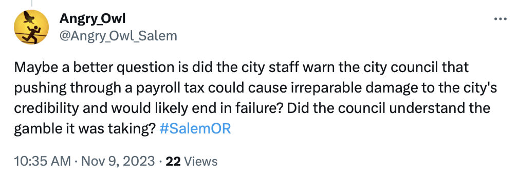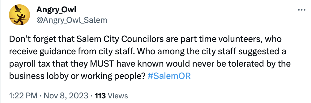 The most important thing they can do is shine a spotlight not on voters or on opponents of the payroll tax, but on themselves. Salem's Angry Owl had this to say in two tweets (I refuse to call it an X post, even though Twitter and Tweets are no more).