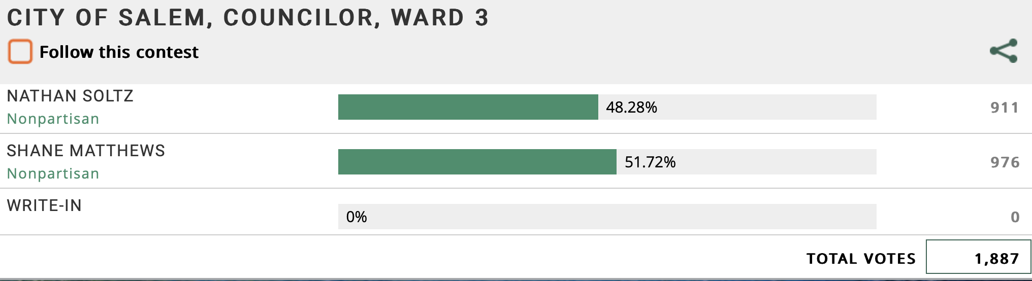 Currently progressives have a 6-3 majority on the nine person Salem City Council, mayor plus eight councilors. With Mayor Hoy's apparent loss, that leaves the progressives at 5-4. So ideological control of the City Council will come down to the Ward 3 and Ward 5 races. Unless the progressive candidate wins one of those wards, conservative members of the City Council will be a majority.