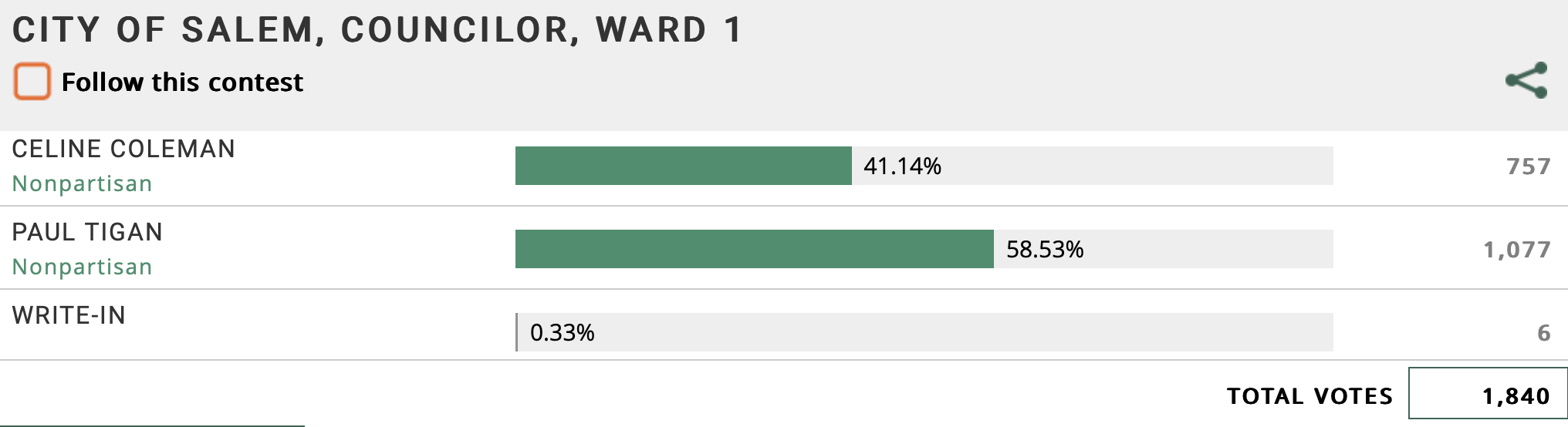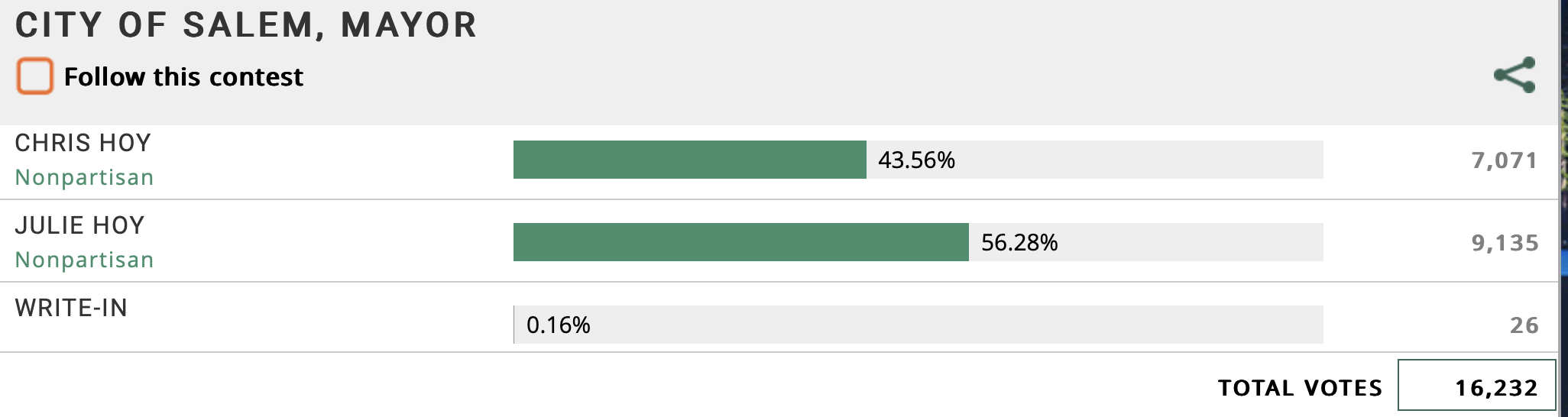 So it sure looks like Julie Hoy will be the next Mayor of Salem. This is the combined initial result for Marion and Polk counties.