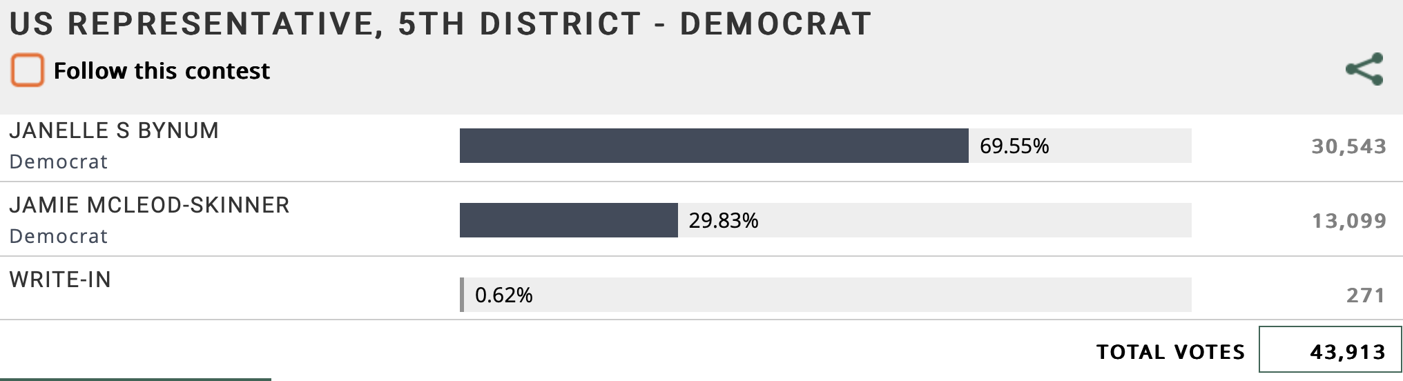 To me the most interesting congressional race was between Janelle Bynum and Jamie McLeod-Skinner in the Democratic primary for the 5th District. Bynum trounced McLeod-Skinner, who narrowly lost in 2022 to Republican Lori Chavez-Deremer. I guess Democratic voters thought it was time for someone new to take on Chavez-Deremer in this swing district.