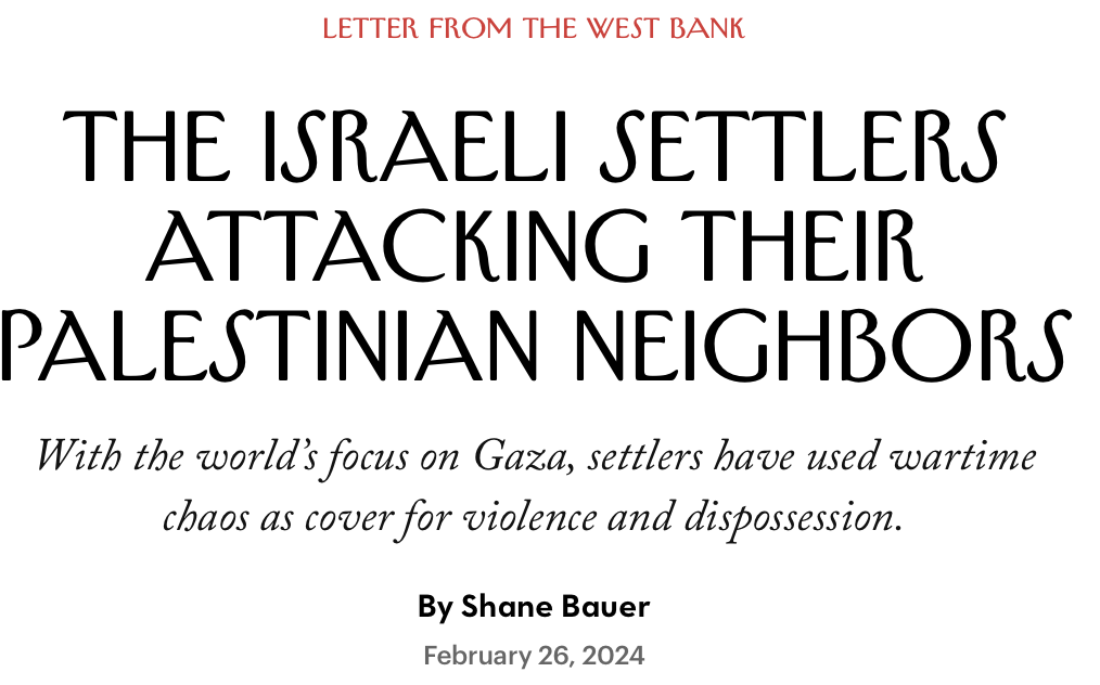 Today I saw two journalists from the New York Times Magazine interviewed about their story on Israeli settler violence and the complicity of the Isreali government in mistreating Palestinians. The short version of the story is: