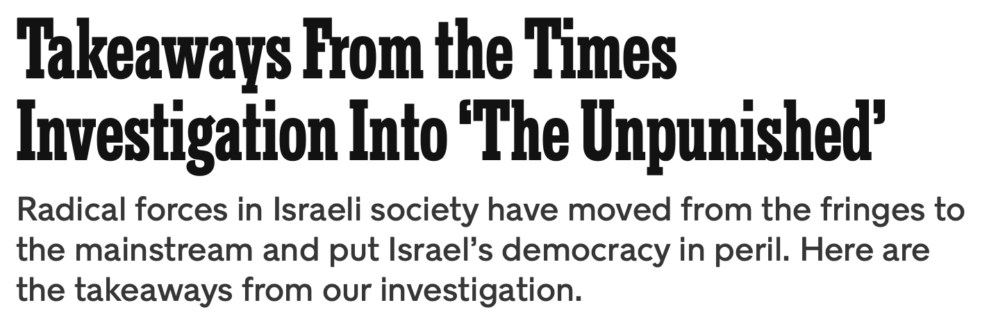 For many of those officials, it is Palestinian terrorism that most threatens Israel. But in interviews with more than 100 people — current and former officers of the Israeli military, the National Israeli Police and the Shin Bet domestic security service; high-ranking Israeli political officials, including four former prime ministers; Palestinian leaders and activists; Israeli human rights lawyers; American officials charged with supporting the Israeli-Palestinian partnership — we found a different and perhaps even more destabilizing threat. A long history of crime without punishment, many of those officials now say, threatens not only Palestinians living in the occupied territories but also the State of Israel itself.