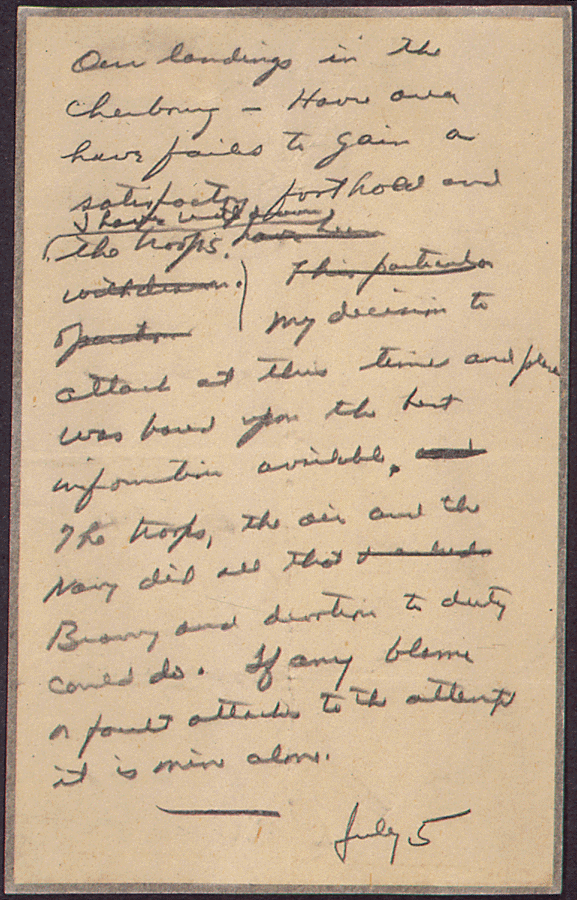 "Our landings in the Cherbourg-Havre area have failed to gain a satisfactory foothold and I have withdrawn the troops. My decision to attack at this time and place was based upon the best information available. The troops, the air and the Navy did all that bravery and devotion to duty could do. If any blame or fault attaches to the attempt it is mine alone."