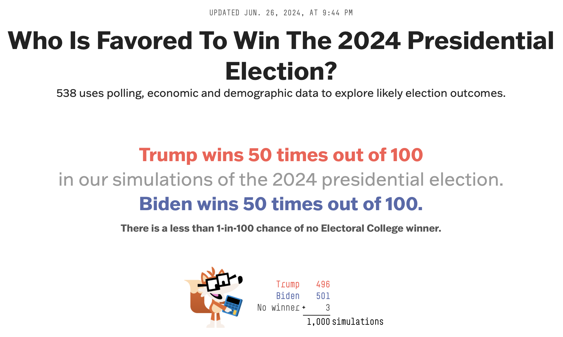 To relieve my anxiety a bit, I just headed to the FiveThirtyEight forecast, which has been my go-to place for election prognosticating over the years. As of today, the site shows a toss-up.Screenshot 2024-06-26 at 9.25.33 PMHey, I'll take a toss-up at this point, given that there's been so much talk about Trump leading in many of the battleground state polls. It'll be interesting to see how the 50-50 FiveThirtyEight forecast changes over the next few weeks, following the debate.