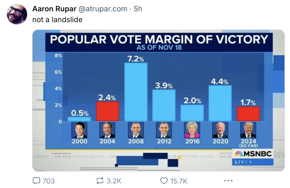 You can see that Trump's popular vote margin of victory was smaller than every presidential election since 2000, aside from Al Gore's very narrow margin of 0.5% in 2000. And California has many more votes to count, so Trump's 2024 margin likely will shrink to 1.6% or 1.5% (currently it is 1.65%, which rounds to 1.7%).