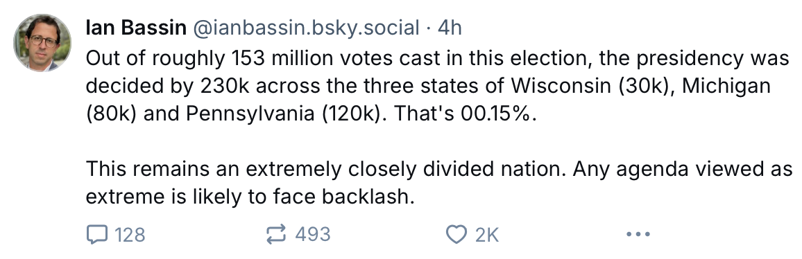 Regarding how many votes enabled Trump to win the Blue Wall states in 2024, another person I follow on Blue Sky has the answer: 230,000. Which is 00.15% of the approximate 153 million votes cast in the election. So a shift from Trump to Harris in the Blue Wall states of about 1/7 of a percent would have meant that Kamala Harris would be announcing her cabinet picks, not Donald Trump.