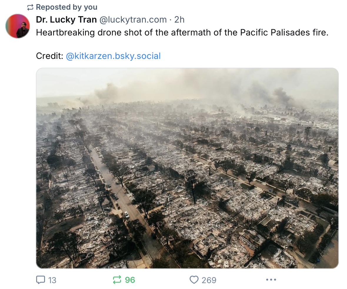 Reports I saw today said that the entire community of Pacific Palisades, which has about 25,000 people, essentially is destroyed. This includes the core of the town: two large grocery stores, high school, restaurants, churches, almost everything. It reminds me of the fire that destroyed the town of Lahaina on Maui, countless lives turned upside down by a wind-fueled wildfire.
