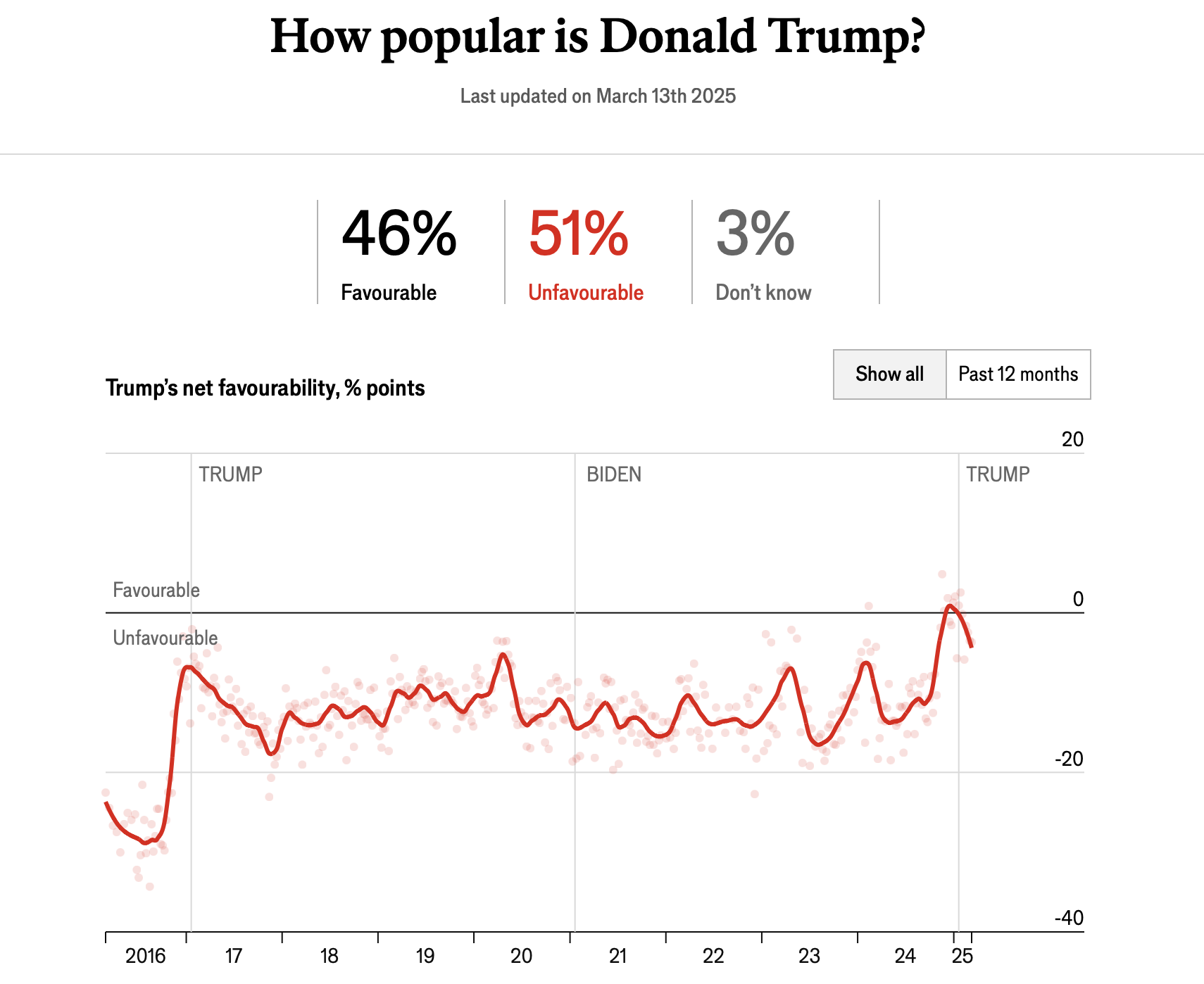 Currently Trump's favorability rating is 46%, with 51% viewing him unfavorably. That's low by the standard of how other presidents have been viewed at this point post-election, but this chart by The Economist shows that Trump is more popular than he was in his first term, and also during Biden's presidency.