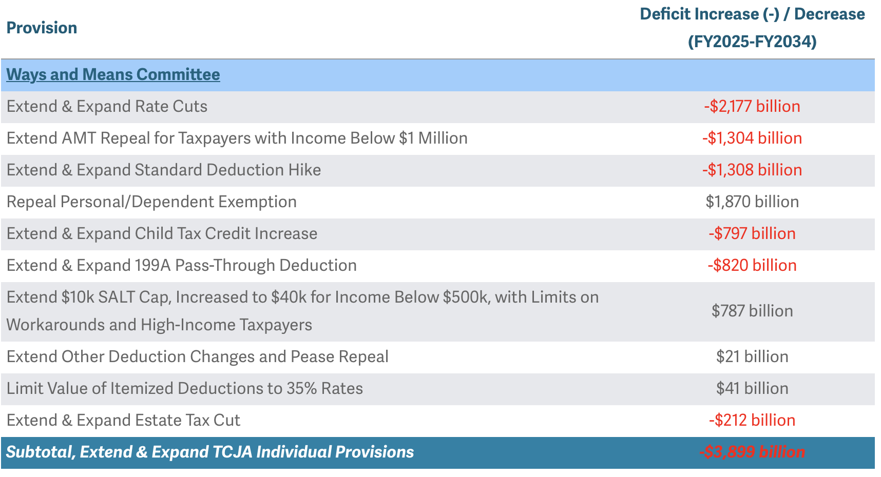 The table below is a comprehensive tally of each provision included in the respective committee bills that make up the OBBBA, along with a deficit impact estimate from the Congressional Budget Office. This table will be updated if additional changes are made.
