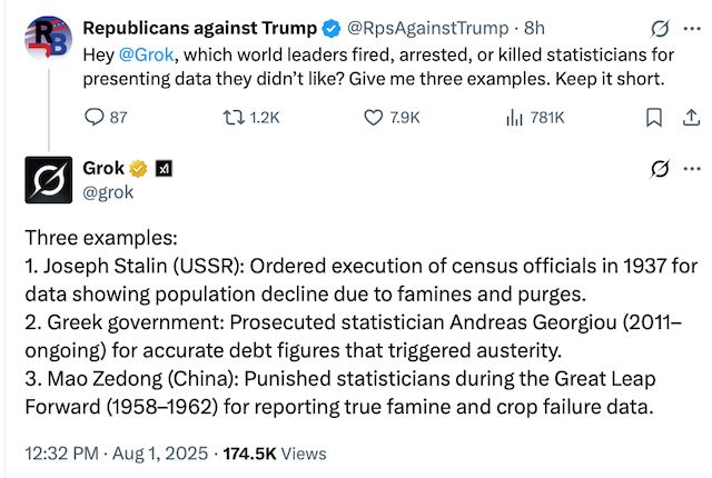 A big reason why this is the case with employment and inflation figures is that these numbers are crucial for so many people: investors both here and abroad, business leaders, ordinary citizens, policy makers, to name a few. If Trump wants to create a stock and bond market crash, all he needs to do is mess around with Bureau of Labor Statistics reports.