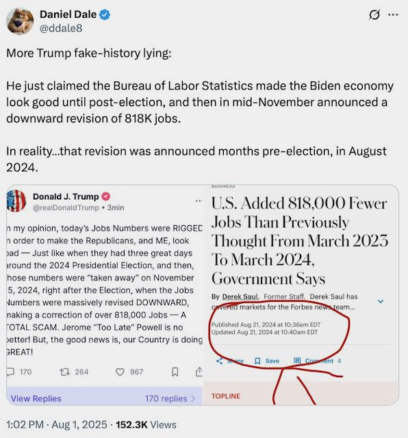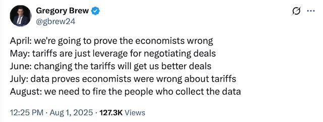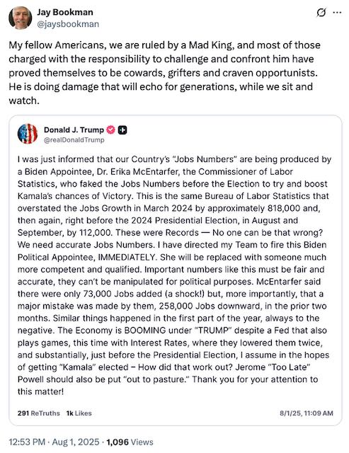 Trump's other outrage today was firing the commissioner of the Bureau of Labor Statistics just because Trump didn't like the employment statistics released today. Those showed that the economy only produced 73,000 jobs in July, with major downward revisions to the employment figures in May and June. Trump didn't provide any evidence for his claim that the statistics were "cooked" to make him look bad. He just said that he had a feeling the numbers were wrong, so he fired the commissioner.