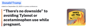 Okay, not you, if you’ve done what I said you shouldn’t do, because I adore  each and every one of my blog visitors. I’m just talking about everybody else who listened to Trump’s incoherent recent remarks about how pregnant women shouldn’t take Tylenol (acetaminophen) even if they have a high fever, because Tylenol causes autism.